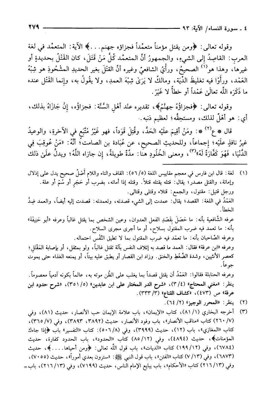 وقوله تعالى: وَمَنْ يَقْتُلْ مُؤْمِناً مُتَعَمِّداً فَجَزاؤُهُ جَهَنَّمُ ... ألاية: المتعمِّد في لغة العربِ: القاصِدُ إلى الشيءِ، والجمهورُ أنَّ المتعمِّد كُلُّ مَنْ قَتَلَ، كان القَتْلُ بحديدةٍ أو غيرها، وهذا هو «1» الصحيحُ، ورأْيُ الشافعيِّ وغيره أنَّ القتْلَ بغير الحديدِ المشْحُوذِ هو شِبْهُ العَمْد، ورأَوْا فيه تغليظَ الدِّيَة، ومالكٌ لا يرى شِبْهَ العمدِ، ولا يقُولُ به، وإنما القَتْل عنده ما ذَكَرَه اللَّه تعالى عَمْداً أو خطأً لا غَيْرُ.