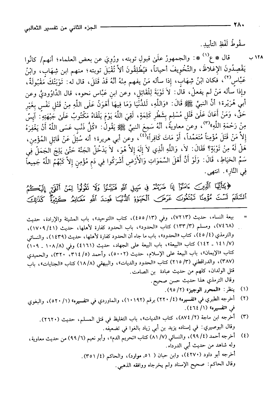 قال ع «1» : والجمهورُ على قبولِ توبته، ورُوِيَ عن بعض العلماء أنهم/ كانُوا يَقْصِدُونَ الإغلاظَ، والتَّخْوِيفَ أحياناً، فيُطْلِقُونَ ألاَّ تُقْبَلَ توبته منهم ابن شِهَابٍ، وابْنُ عَبَّاسٍ «2» ، فكان ابْنُ شِهَابٍ، إذا سأله مَنْ يفهم مِنْهُ أنَّهُ قَدْ قَتَلَ، قال له: تَوْبَتُكَ مَقْبُولَةٌ، وإذا سأله مَنْ لم يفعلْ، قال: لاَ تَوْبَةَ لِلْقَاتِلِ، وعن ابنِ عَبَّاس نحوه، قال الدَّاوُوديُّ وعن أبي هُرَيْرة أنَّ النبيَّ صلّى الله عليه وسلّم قَالَ: «وَاللَّهِ، لَلدُّنْيَا وَمَا فِيهَا أَهْوَنُ عَلَى اللَّهِ مِنْ قَتْلِ نَفْسٍ بِغَيْرِ حَقٍّ، وَمَنْ أَعَانَ على قَتْلِ مُسْلِمٍ بِشَطْرِ كَلِمَةٍ، لَقِيَ اللَّهَ يَوْمَ يَلْقَاهُ مَكْتُوبٌ على جَبْهَتِهِ: آيِسٌ مِنْ رَحْمَةِ اللَّهِ» «3» ، وعن معاويةَ، أنَّهُ سَمِعَ النبيّ صلّى الله عليه وسلّم يَقُولُ: «كُلُّ ذَنْبٍ عَسَى اللَّهُ أَنْ يَغْفِرَهُ إلاَّ مَنْ قَتَلَ مُؤْمِناً مُتَعَمِّداً، أَوْ مَاتَ كَافِراً» «4» ، وعن أبي هريرة أنه سُئِلَ عَنْ قَاتِلِ المُؤْمِنِ، هَلْ لَهُ مِنْ تَوْبَةٍ؟ فَقَالَ: لاَ، وَاللَّهِ الَّذِي لاَ إلَهَ إلاَّ هُوَ، لاَ يَدْخُلُ الجَنَّة حتى يَلِجَ الجَمَلُ فِي سَمِّ الخيَاطِ، قَالَ: وَلَوْ أَنَّ أَهْلَ السَّمَوَاتِ وَالأرْضِ أَشْرَكُوا فِي دَمِ مُؤْمِنٍ إلاَّ كَبَّهُمُ الله جميعا في النّار» . انتهى.
