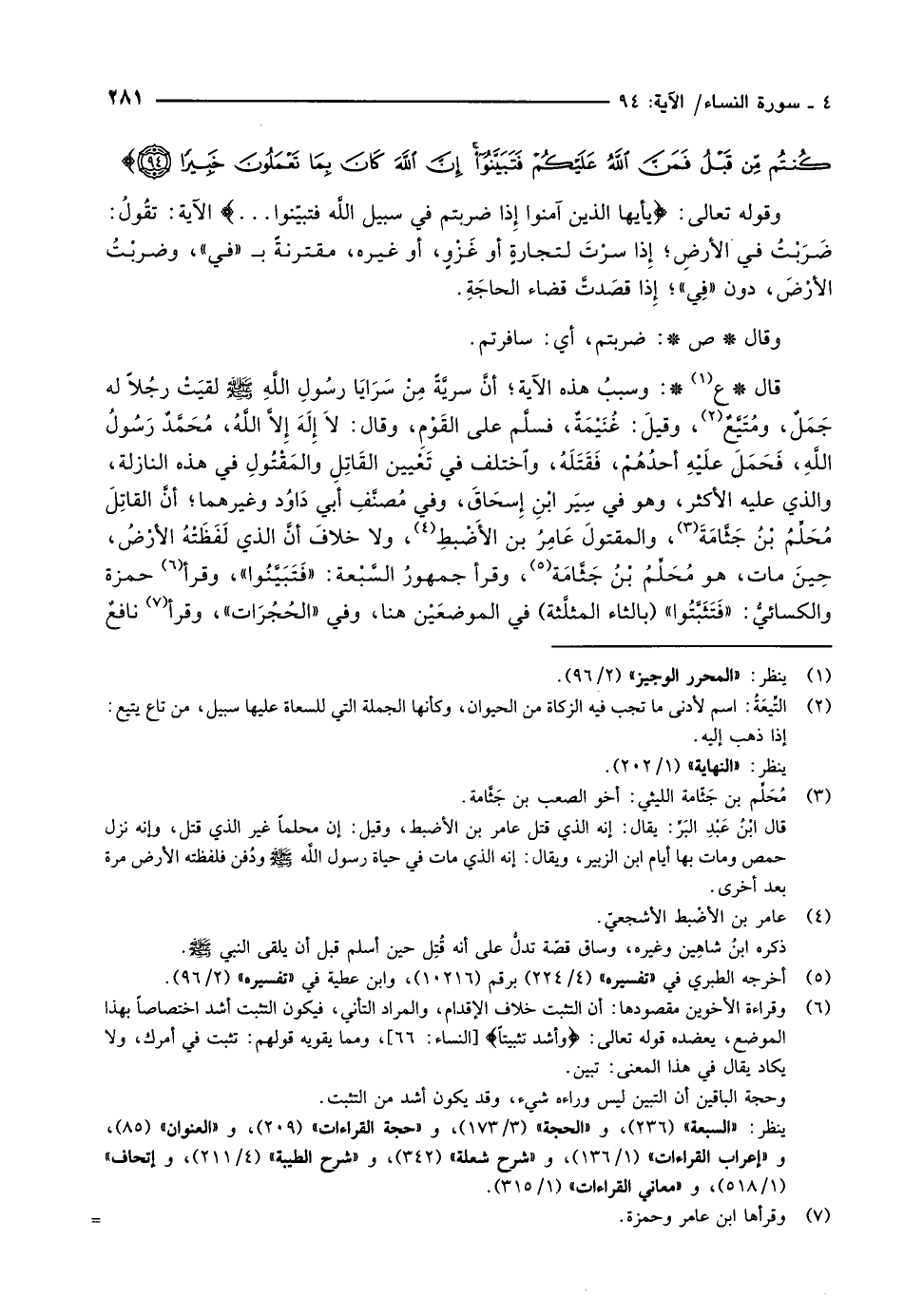 قال ع «1» : وسببُ هذه الآية أنَّ سريَّةً مِنْ سرايا رسول الله صلّى الله عليه وسلّم لقيَتْ رجُلاً له جَمَلٌ، ومُتَيَّعٌ «2» ، وقيلَ: غُنَيْمَةٌ، فسلَّم على القَوْمِ، وقال: لاَ إلَهَ إلاَّ اللَّهُ، مُحَمَّدٌ رَسُولُ اللَّهِ، فَحَمَلَ علَيْهِ أحدُهُمْ، فَقَتَلَهُ، واختلف في تَعْيين القَاتِلِ والمَقْتُولِ في هذه النازلة، والذي عليه الأكثر، وهو في سِيَر ابْنِ إسحَاقَ، وفي مُصنَّفِ أبي دَاوُد وغيرهما أنَّ القاتِلَ مُحَلِّمُ بْنُ جَثَّامَةَ «3» ، والمقتولَ عَامِرُ بن الأَضْبطِ «4» ، ولا خلافَ أنَّ الذي لَفَظَتْهُ الأرْضُ، حِينَ مات، هو مُحَلِّمُ بْنُ جَثَّامَة «5» ، وقرأ جمهورُ السَّبْعة: «فَتََبَيَّنُوا» ، وقرأ «6» حمزة والكسائيُّ: «فَتَثَبَّتُوا» (بالثاء المثلَّثة) في الموضعَيْن هنا، وفي «الحجرات» ، وقرأ «7» نافع