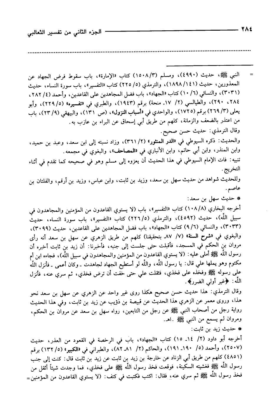 أخرجه البخاري (8/ 108) كتاب «التفسير» ، باب (لا يستوي القاعدون من المؤمنين والمجاهدون في سبيل الله) ، حديث (4592) ، والترمذي (5/ 226) كتاب «التفسير» ، باب سورة النساء، حديث (3033) ، والنسائي (6/ 9) كتاب «الجهاد» ، باب فضل المجاهدين على القاعدين، حديث (3099) ، والبغوي في «شرح السنة» (7/ 87- بتحقيقنا) كلهم من طريق الزهري عن سهل بن سعد أنه رأى مروان بن الحكم في المسجد، فأقبلت حتى جلست إلى جنبه، فأخبرنا: أن زيد بن ثابت أخبره أن رسول الله صلّى الله عليه وسلّم أملى عليه: (لا يستوي القاعدون من المؤمنين والمجاهدون في سبيل الله) ، فجاءه ابن أم مكتوم وهو يملها علي قال: يا رسول الله، والله لو أستطيع الجهاد لجاهدت- وكان أعمى- فأنزل الله على رسوله صلّى الله عليه وسلّم وفخذه على فخذي، فثقلت علي حتى خفت أن ترض فخذي، ثم سري عنه، فأنزل الله: غَيْرُ أُولِي الضَّرَرِ.