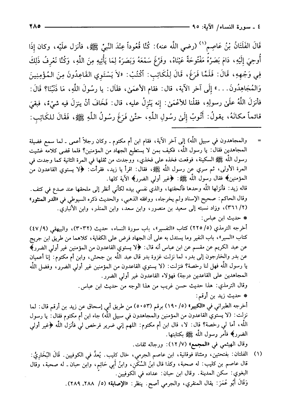 - والمجاهدون في سبيل الله) إلى آخر الآية، فقام ابن أم مكتوم- وكان رجلا أعمى- لما سمع فضيلة المجاهدين فقال: يا رسول الله، فكيف بمن لا يستطيع الجهاد من المؤمنين؟ فلما قضى كلامه غشيت رسول الله صلّى الله عليه وسلّم السكينة، فوقعت فخذه على فخذي، ووجدت من ثقلها في المرة الثانية كما وجدت في المرة الأولى، ثم سري عن رسول الله صلّى الله عليه وسلّم، فقال: اقرأ يا زيد، فقرأت: لا يَسْتَوِي الْقاعِدُونَ مِنَ الْمُؤْمِنِينَ فقال رسول الله صلّى الله عليه وسلّم: غَيْرُ أُولِي الضَّرَرِ الآية كلها.