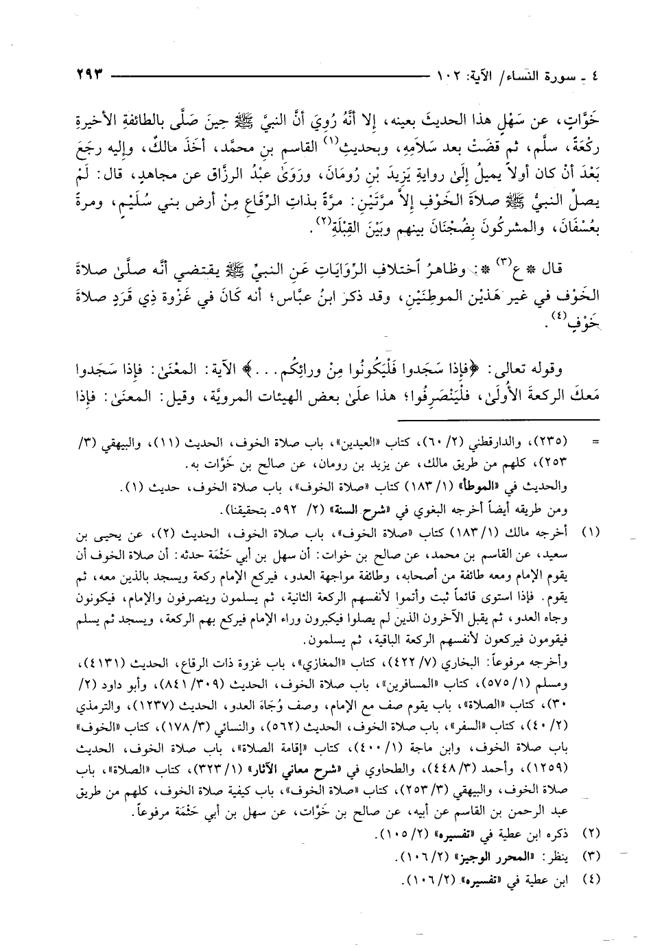 (1) أخرجه مالك (1/ 183) كتاب «صلاة الخوف» ، باب صلاة الخوف، الحديث (2) ، عن يحيى بن سعيد، عن القاسمُ بْنُ محمَّدٍ، عن صالحِ بْنِ خَوَّاتٍ: أن سهل بن أبي حثمة حدثه: أن صلاة الخوف أن يقوم الإمام ومعه طائفة من أصحابه، وطائفة مواجهة العدو، فيركع الإمام ركعة ويسجد بالذين معه، ثم يقوم. فإذا استوى قائما ثبت وأتموا لأنفسهم الركعة الثانية، ثم يسلمون وينصرفون والإمام، فيكونون وجاه العدو، ثم يقبل الآخرون الذين لم يصلوا فيكبرون وراء الإمام فيركع بهم الركعة، ويسجد ثم يسلم فيقومون فيركعون لأنفسهم الركعة الباقية، ثم يسلمون.