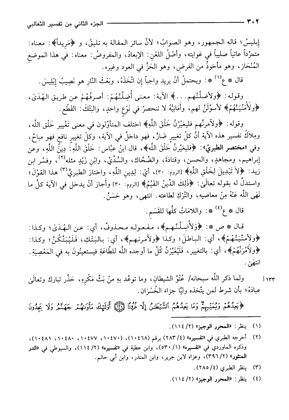 وقوله: وَلَأُضِلَّنَّهُمْ ... الآية: معنى أُضِلَّنَّهُمْ: أصرفُهُمْ عن طريقِ الهدى، وَلَأُمَنِّيَنَّهُمْ لأسوِّلَنَّ لهم، وأَمَانِيُّهُ لا تنحصرُ في نَوْعٍ واحدٍ، والبَتْكَ: القَطْع.