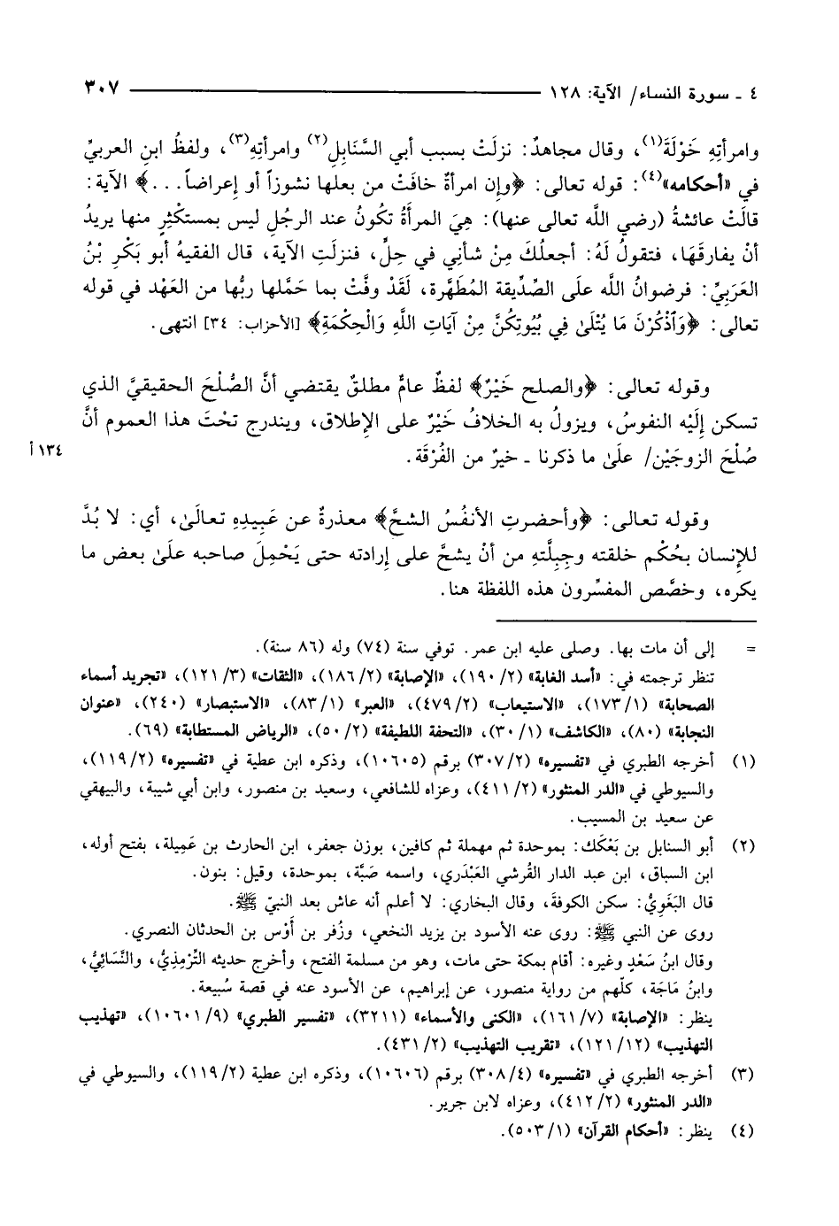 وامرأتِهِ خَوْلَةَ «1» ، وقال مجاهدٌ: نزلَتْ بسبب أبي السَّنَابِلِ «2» وامرأتِهِ «3» ، ولفظُ ابنِ العربيِّ في «أحكامه» «4» : قوله تعالى: وَإِنِ امْرَأَةٌ خافَتْ مِنْ بَعْلِها نُشُوزاً أَوْ إِعْراضاً ... الآية: