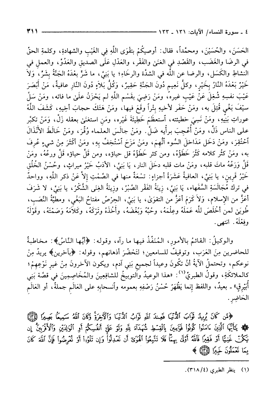 مَنْ كانَ يُرِيدُ ثَوابَ الدُّنْيا فَعِنْدَ اللَّهِ ثَوابُ الدُّنْيا وَالْآخِرَةِ وَكانَ اللَّهُ سَمِيعاً بَصِيراً (134) يا أَيُّهَا الَّذِينَ آمَنُوا كُونُوا قَوَّامِينَ بِالْقِسْطِ شُهَداءَ لِلَّهِ وَلَوْ عَلى أَنْفُسِكُمْ أَوِ الْوالِدَيْنِ وَالْأَقْرَبِينَ إِنْ يَكُنْ غَنِيًّا أَوْ فَقِيراً فَاللَّهُ أَوْلى بِهِما فَلا تَتَّبِعُوا الْهَوى أَنْ تَعْدِلُوا وَإِنْ تَلْوُوا أَوْ تُعْرِضُوا فَإِنَّ اللَّهَ كانَ بِما تَعْمَلُونَ خَبِيراً (135)