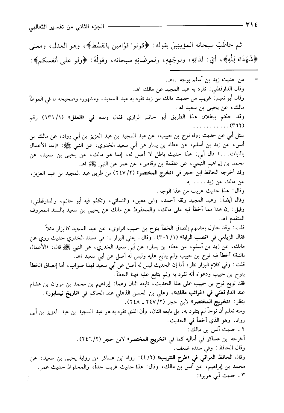 سئل أبي عن حديث رواه نوح بن حبيب، عن عبد المجيد بن عبد العزيز بن أبي رواد، عن مالك بن أنس، عن زيد بن أسلم، عن عطاء بن يسار عن أبي سعيد الخدري، عن النبيّ صلّى الله عليه وسلّم: «إنما الأعمال بالنيات ... » قال أبي: هذا حديث باطل لا أصل له، إنما هو مالك، عن يحيى بن سعيد، عن محمد بن إبراهيم التيمي، عن علقمة بن وقاص، عن عمر عن النبيّ صلّى الله عليه وسلّم اهـ.