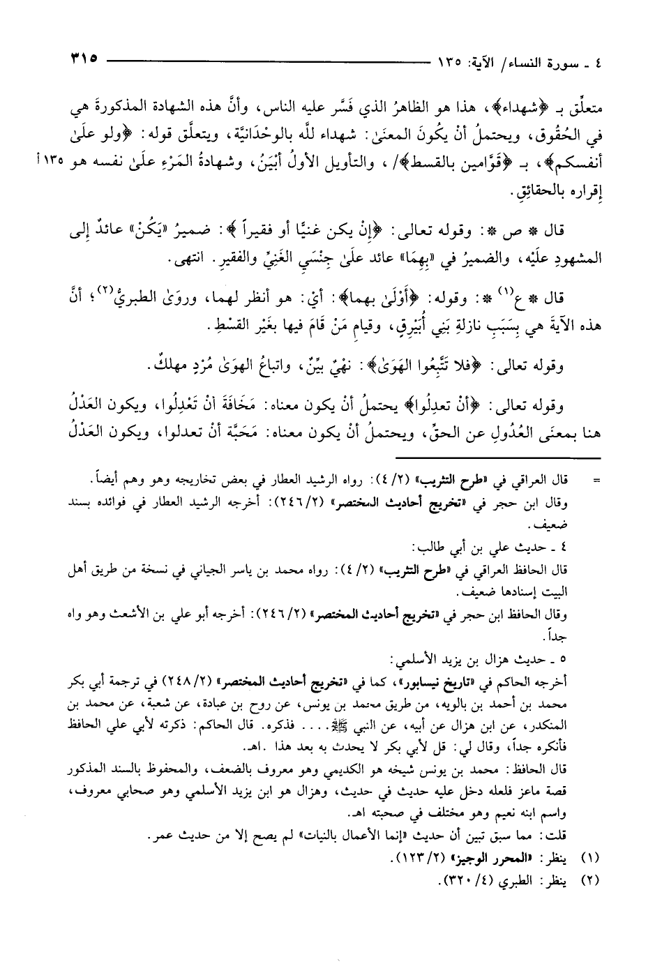 قال ص: وقوله تعالى: إِنْ يَكُنْ غَنِيًّا أَوْ فَقِيراً: ضميرُ «يَكُنْ» عائدٌ إلى المشهودِ علَيْه، والضميرُ في «بِهِمَا» عائد على جِنْسَيِ الغَنِيِّ والفقيرِ. انتهى.