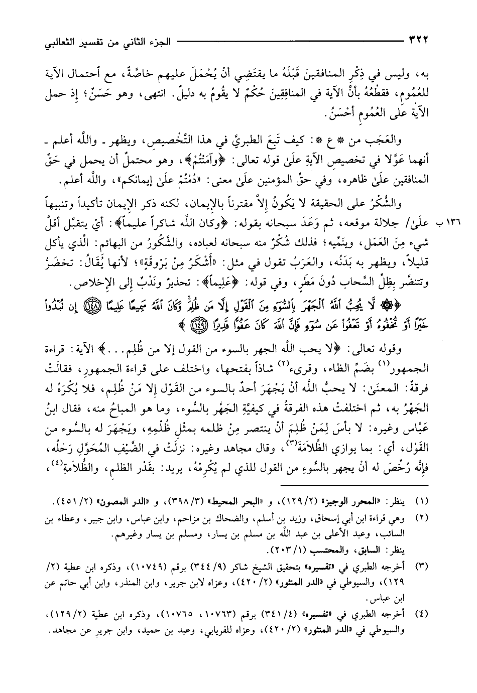 وقوله تعالى: لاَّ يُحِبُّ اللَّهُ الْجَهْرَ بِالسُّوءِ مِنَ الْقَوْلِ إِلَّا مَنْ ظُلِمَ ... الآية: قراءة الجمهور «1» بضَمِّ الظاء، وقرىء «2» شاذاً بفتحها، واختلف على قراءة الجمهورِ، فقالَتْ فرقةٌ: المعنى: لا يحبُّ اللَّه أنْ يَجْهَرَ أحدٌ بالسوء من القَوْل إلا مَنْ ظُلِم، فلا يُكْرَهُ له الجَهْرُ به، ثم اختلفتْ هذه الفرقةُ في كيفيَّةِ الجَهْر بالسُّوء، وما هو المباحُ منه، فقال ابنُ عَبَّاس وغيره: لا بأسَ لِمَنْ ظلم أن ينتصر من ظلمه بمثْلِ ظُلْمِهِ، ويَجْهَرَ له بالسُّوء من القَوْل، أي: بما يوازي الظَّلاَمَةَ «3» ، وقال مجاهد وغيره: نزلَتْ في الضَّيْفِ المُحَوَّلِ رَحْلُه، فإنَّه رُخِّصَ له أنْ يجهر بالسُّوءِ من القول للذي لم يُكْرِمْهُ، يريد: بقَدْر الظلمِ، والظُّلاَمةِ «4» ،