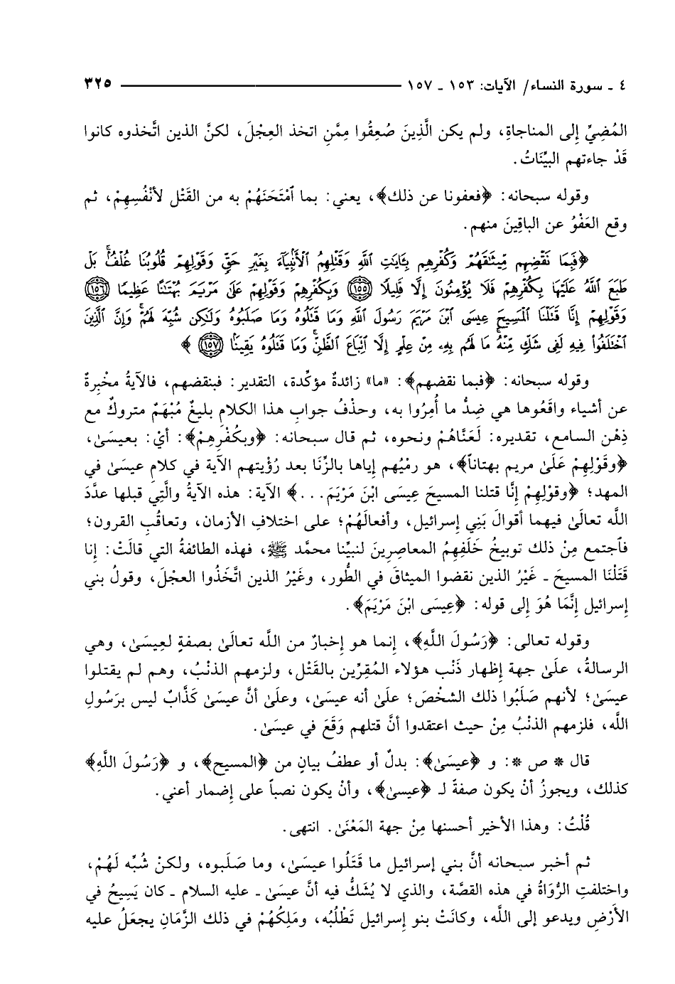 فَبِما نَقْضِهِمْ مِيثاقَهُمْ وَكُفْرِهِمْ بِآياتِ اللَّهِ وَقَتْلِهِمُ الْأَنْبِياءَ بِغَيْرِ حَقٍّ وَقَوْلِهِمْ قُلُوبُنا غُلْفٌ بَلْ طَبَعَ اللَّهُ عَلَيْها بِكُفْرِهِمْ فَلا يُؤْمِنُونَ إِلاَّ قَلِيلاً (155) وَبِكُفْرِهِمْ وَقَوْلِهِمْ عَلى مَرْيَمَ بُهْتاناً عَظِيماً (156) وَقَوْلِهِمْ إِنَّا قَتَلْنَا الْمَسِيحَ عِيسَى ابْنَ مَرْيَمَ رَسُولَ اللَّهِ وَما قَتَلُوهُ وَما صَلَبُوهُ وَلكِنْ شُبِّهَ لَهُمْ وَإِنَّ الَّذِينَ اخْتَلَفُوا فِيهِ لَفِي شَكٍّ مِنْهُ ما لَهُمْ بِهِ مِنْ عِلْمٍ إِلاَّ اتِّباعَ الظَّنِّ وَما قَتَلُوهُ يَقِيناً (157)