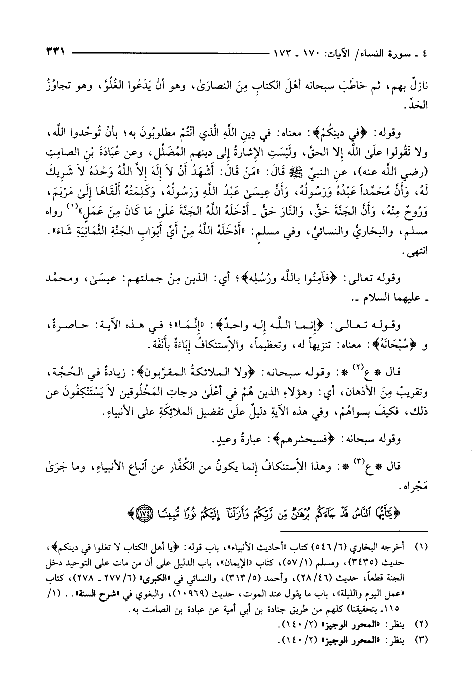 وقوله: فِي دِينِكُمْ: معناه: في دِينِ اللَّهِ الَّذي أنْتُمْ مطلوبُونَ به بأنْ تُوحِّدوا اللَّه، ولا تَقُولوا على اللَّه إلا الحقَّ، ولَيْسَتِ الإشارةُ إلى دينهم المُضَلِّل، وعن عُبَادَةَ بْنِ الصامِتِ (رضي اللَّه عنه) ، عنِ النبيّ صلّى الله عليه وسلّم قَالَ: «مَنْ قَالَ: أَشْهَدُ أَنْ لاَ إلَهَ إلاَّ اللَّهُ وَحْدَهُ لاَ شَرِيكَ لَهُ، وَأَنَّ مُحَمَّداً عَبْدُهُ وَرَسُولُهُ، وَأَنَّ عيسى عَبْدُ اللَّهِ وَرَسُولُهُ، وَكَلِمَتُهُ أَلْقَاهَا إلى مَرْيَمَ، وَرُوحٌ مِنْهُ، وَأَنَّ الجَنَّةَ حَقٌّ، وَالنَّارَ حَقٌّ- أَدْخَلَهُ اللَّهُ الجَنَّةَ على مَا كَانَ مِنَ عَمَلٍ» «1» رواه مسلم، والبخاريُّ والنسائيُّ، وفي مسلمٍ: «أَدْخَلَهُ اللَّهُ مِنْ أَيِّ أَبْوَابِ الجَنَّةِ الثَّمَانِيَةِ شَاءَ» .