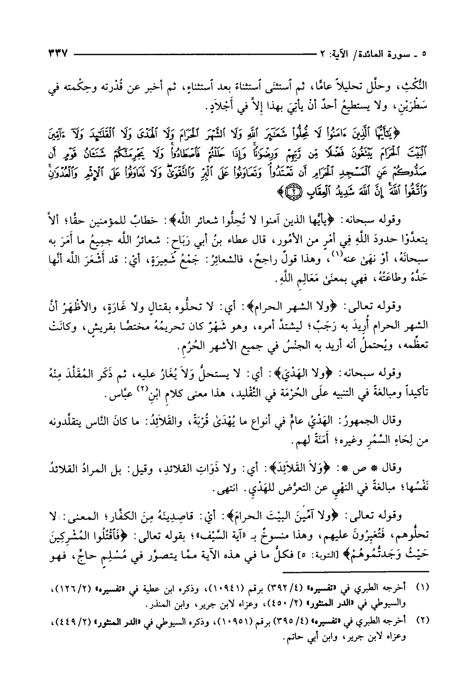 يا أَيُّهَا الَّذِينَ آمَنُوا لا تُحِلُّوا شَعائِرَ اللَّهِ وَلا الشَّهْرَ الْحَرامَ وَلا الْهَدْيَ وَلا الْقَلائِدَ وَلا آمِّينَ الْبَيْتَ الْحَرامَ يَبْتَغُونَ فَضْلاً مِنْ رَبِّهِمْ وَرِضْواناً وَإِذا حَلَلْتُمْ فَاصْطادُوا وَلا يَجْرِمَنَّكُمْ شَنَآنُ قَوْمٍ أَنْ صَدُّوكُمْ عَنِ الْمَسْجِدِ الْحَرامِ أَنْ تَعْتَدُوا وَتَعاوَنُوا عَلَى الْبِرِّ وَالتَّقْوى وَلا تَعاوَنُوا عَلَى الْإِثْمِ وَالْعُدْوانِ وَاتَّقُوا اللَّهَ إِنَّ اللَّهَ شَدِيدُ الْعِقابِ (2)