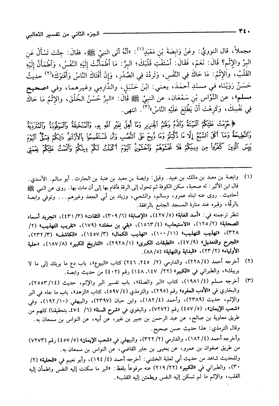 (3) أخرجه مسلم (4/ 1981) ، كتاب «البر والصلة» ، باب تفسير البر والإثم، حديث (14/ 2553) ، والبخاري في «الأدب المفرد» رقم (295) ، والترمذي (4/ 597) ، كتاب «الزهد» ، باب ما جاء في البر والإثم، حديث (2389) ، وأحمد (4/ 182) ، وابن حبان (2397) ، والبيهقي (10/ 192) ، وفي «شعب الإيمان» ، (5/ 457) رقم (7272) ، والبغوي في «شرح السنة» (6/ 474- بتحقيقنا) كلهم من طريق معاوية بن صالح، عن عبد الرّحمن بن جبير بن نفير، عن أبيه، عن النواس بن سمعان به.