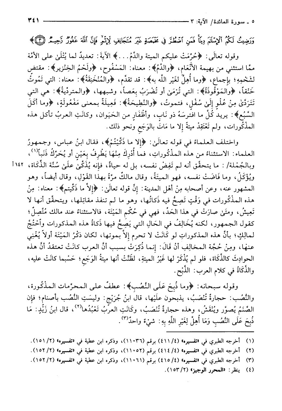 وقوله تعالَى: حُرِّمَتْ عَلَيْكُمُ الْمَيْتَةُ وَالدَّمُ ... الآية: تعديدٌ لما يتلى على الأمَّة ممَّا استثنَي من بهيمة الأَنْعَامِ، وَالدَّمُ: معناه: المَسْفُوح، وَلَحْمُ الْخِنْزِيرِ: مقتض لشخمه بإجماع، وَما أُهِلَّ لِغَيْرِ اللَّهِ بِهِ: قد تقدّم، وَالْمُنْخَنِقَةُ: معناه: التي تموت حنقا، وَالْمَوْقُوذَةُ: التي ترمى أو تُضْرَبُ بِعَصاً، وشبهها، وَالْمُتَرَدِّيَةُ: هي التي تتردى مِنْ عُلْوٍ إلى سُفْلٍ، فتموتُ، وَالنَّطِيحَةُ: فَعِيلَةٌ بمعنى مَفْعُولَةٍ، وَما أَكَلَ السَّبُعُ: يريد كُلَّ ما افترسَهُ ذو نَابٍ، وأظْفَارٍ من الحَيَوان، وكانَتِ العربُ تأكل هذه المذْكُورات، ولم تَعْتَقِدْ ميتةً إلا ما مَاتَ بالوَجَعِ ونحو ذلك.