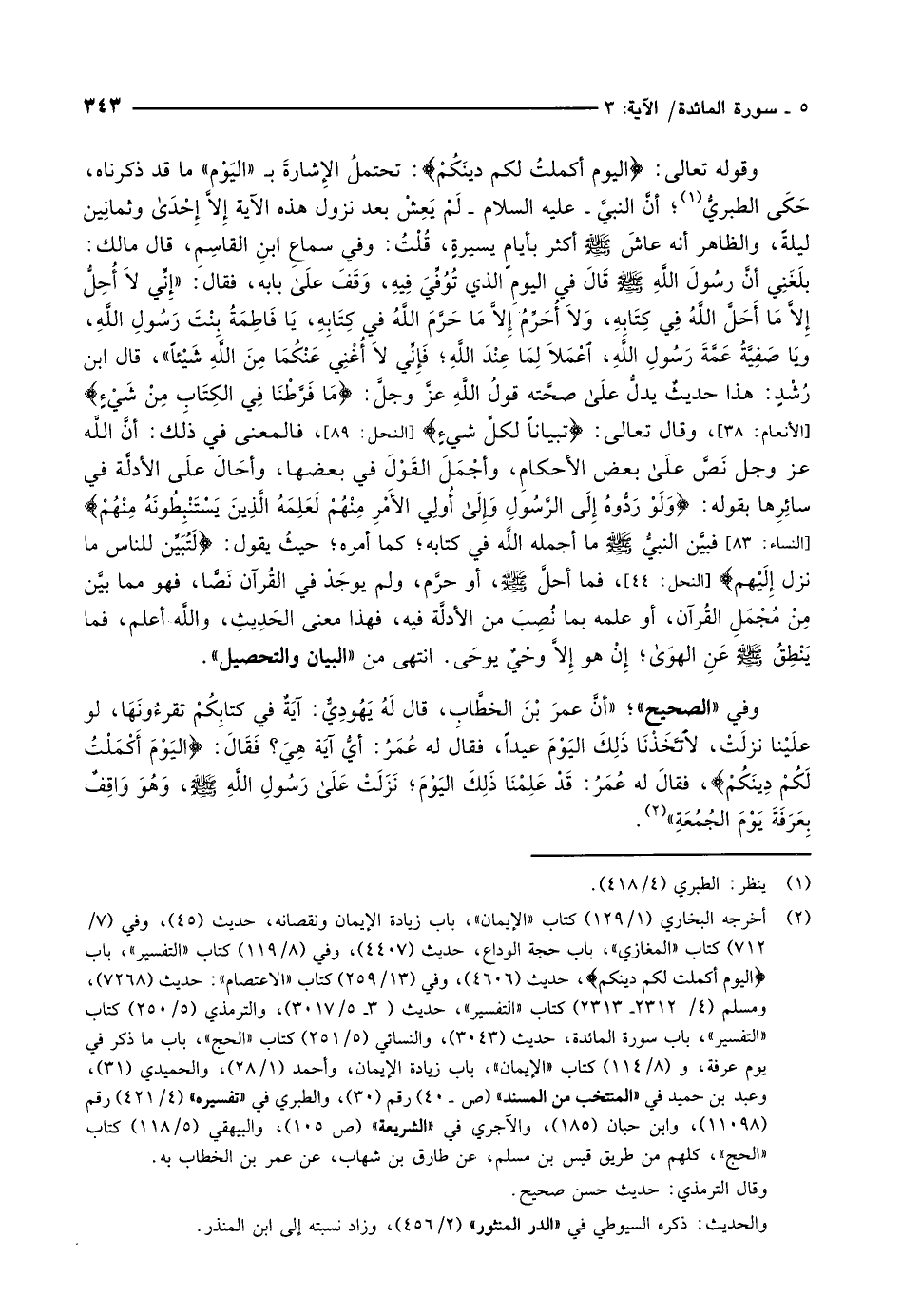 (2) أخرجه البخاري (1/ 129) كتاب «الإيمان» ، باب زيادة الإيمان ونقصانه، حديث (45) ، وفي (7/ 712) كتاب «المغازي» ، باب حجة الوداع، حديث (4407) ، وفي (8/ 119) كتاب «التفسير» ، باب الْيَوْمَ أَكْمَلْتُ لَكُمْ دِينَكُمْ، حديث (4606) ، وفي (13/ 259) كتاب «الاعتصام» : حديث (7268) ، ومسلم (4/ 2312- 2313) كتاب «التفسير» ، حديث (3- 5/ 3017) ، والترمذي (5/ 250) كتاب «التفسير» ، باب سورة المائدة، حديث (3043) ، والنسائي (5/ 251) كتاب «الحج» ، باب ما ذكر في يوم عرفة، و (8/ 114) كتاب «الإيمان» ، باب زيادة الإيمان، وأحمد (1/ 28) ، والحميدي (31) ، وعبد بن حميد في «المنتخب من المسند» (ص- 40) رقم (30) ، والطبري في «تفسيره» (4/ 421) رقم (11098) ، وابن حبان (185) ، والآجري في «الشريعة» (ص 105) ، والبيهقي (5/ 118) كتاب «الحج» ، كلهم من طريق قيس بن مسلم، عن طارق بن شهاب، عن عمر بن الخطاب به.