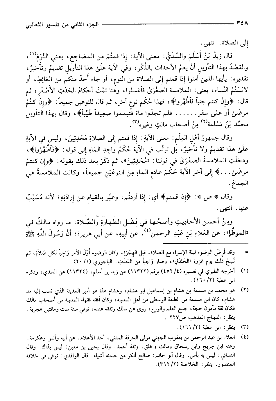 قال زيدُ بْنُ أَسْلَمَ والسُّدِّيُّ: معنى الآية: إذا قمتُمْ من المضاجِعِ، يعني النَّوْمَ «1» ، والقصْدُ بهذا التأويلِ أنْ يعمَّ الأحداث بالذِّكْر، وفي الآية على هذا التأويلِ تقديمٌ وتأْخيرٌ، تقديره: يا أيها الذين آمنوا إذا قمتم إلى الصلاة من النومِ، أو جاء أَحدٌ منكم من الغائِطِ، أو لامَسْتُمُ النِّساء، يعني: الملامسة الصغرى فاغسلوا، وهنا تمَّتْ أحكامُ الحَدَثِ الأَصْغَرِ، ثم قال: وَإِنْ كُنْتُمْ جُنُباً فَاطَّهَّرُوا، فهذا حُكْم نوعٍ آخر، ثم قال للنوعين جميعاً: وَإِنْ كُنْتُمْ مَرْضى أَوْ عَلى سَفَرٍ ... فَلَمْ تَجِدُوا مَاء فَتَيَمَّمُوا صَعِيداً طَيِّباً، وقال بهذا التأويل محمَّد بْنُ مَسْلمة «2» مِنْ أصحاب مالكٍ وغيره «3» .