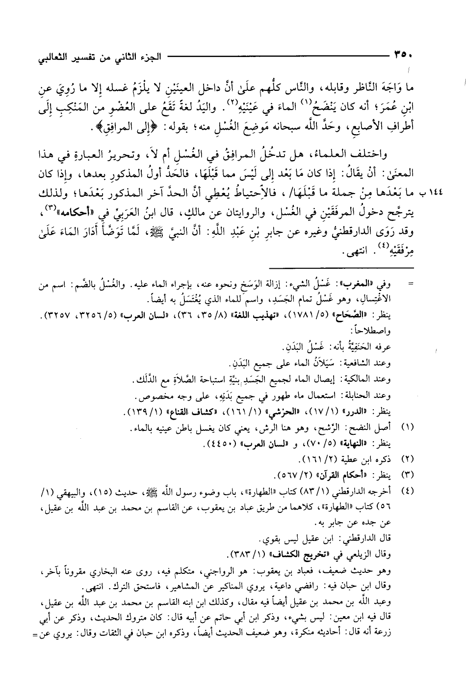 واختلف العلماءُ، هل تدخُلُ المرافِقُ في الغُسْلِ أم لاَ، وتحريرُ العبارةِ في هذا المعنى: أنْ يقَالُ: إذا كان مَا بَعْد إلى لَيْسَ مما قَبْلَهَا، فالحَدُّ أولُ المذكورِ بعدها، وإذا كان ما بَعْدَها مِنْ جملة ما قَبْلَهَا/، فالاحتياطُ يُعْطِي أنَّ الحدَّ آخر المذكور بَعْدَها ولذلك يترجَّح دخولُ المرفَقَيْنِ في الغُسْل، والروايتان عن مالكٍ، قال ابنُ العَرَبِيِّ في «أحكامه» «3» ، وقد رَوَى الدارقطنيُّ وغيره عن جابرِ بْنِ عَبْدِ اللَّهِ: أنَّ النبيَّ صلّى الله عليه وسلّم، لَمَّا تَوَضَّأَ أَدَارَ المَاءَ على مِرْفَقَيْهِ «4» . انتهى.