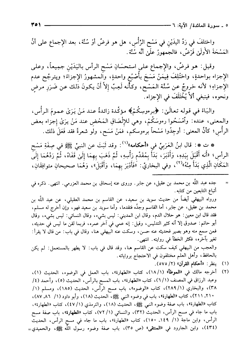 (2) أخرجه مالك في «الموطأ» (1/ 18) ، كتاب «الطهارة» ، باب العمل في الوضوء، الحديث (1) ، وعبد الرزاق في المصنف (1/ 6) ، كتاب «الطهارة» ، باب المسح بالرأس، الحديث (5) ، وأحمد (4/ 38) ، والبخاري (1/ 289) ، كتاب «الوضوء» ، باب مسح الرأس، الحديث (185) ، ومسلم (1/ 210- 211) ، كتاب «الطهارة» ، باب في وضوء النبيّ صلّى الله عليه وسلّم، الحديث (18) وأبو داود (1/ 86- 87) ، كتاب «الطهارة» ، باب صفة وضوء النبيّ صلّى الله عليه وسلّم، الحديث (18) ، والترمذي (1/ 47) ، كتاب «الطهارة» ، باب ما جاء في مسح الرأس، الحديث (32) ، والنسائي (1/ 72) ، كتاب «الطهارة» ، باب صفة مسح الرأس، وابن ماجة (1/ 149- 150) ، كتاب «الطهارة» ، باب ما جاء في مسح الرأس، الحديث (434) ، وابن الجارود في «المنتقى» (ص 35) ، باب صفة وضوء رسول الله صلّى الله عليه وسلّم، والحميدي-