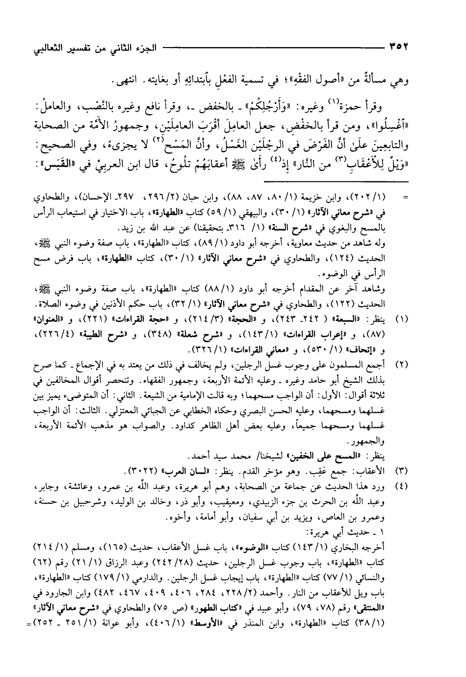 (2) أجمع المسلمون على وجوب غسل الرجلين، ولم يخالف في ذلك من يعتد به في الإجماع- كما صرح بذلك الشيخ أبو حامد وغيره- وعليه الأئمة الأربعة، وجمهور الفقهاء. وتنحصر أقوال المخالفين في ثلاثة أقوال: الأول: أن الواجب مسحهما وبه قالت الإمامية من الشيعة. الثاني: أن المتوضئ يميز بين غسلهما ومسحهما، وعليه الحسن البصري وحكاه الخطابي عن الجبائي المعتزلي. الثالث: أن الواجب غسلهما ومسحهما جميعا، وعليه بعض أهل الظاهر كداود. والصواب هو مذهب الأئمة الأربعة، والجمهور.