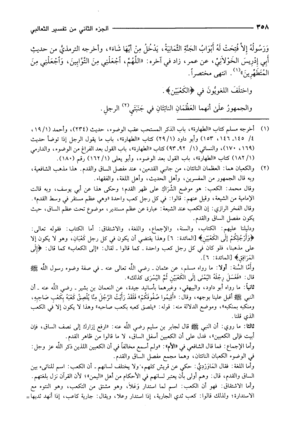 (2) والكعبان هما: العظمان الناتئان، من جانبي القدمين، عند مفصل الساق والقدم. هذا مذهب الشافعية، وبه قال الجمهور من المفسرين، وأهل الحديث، وأهل اللغة، والفقهاء.