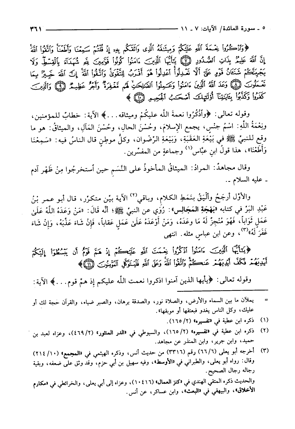 وَاذْكُرُوا نِعْمَةَ اللَّهِ عَلَيْكُمْ وَمِيثاقَهُ الَّذِي واثَقَكُمْ بِهِ إِذْ قُلْتُمْ سَمِعْنا وَأَطَعْنا وَاتَّقُوا اللَّهَ إِنَّ اللَّهَ عَلِيمٌ بِذاتِ الصُّدُورِ (7) يا أَيُّهَا الَّذِينَ آمَنُوا كُونُوا قَوَّامِينَ لِلَّهِ شُهَداءَ بِالْقِسْطِ وَلا يَجْرِمَنَّكُمْ شَنَآنُ قَوْمٍ عَلى أَلاَّ تَعْدِلُوا اعْدِلُوا هُوَ أَقْرَبُ لِلتَّقْوى وَاتَّقُوا اللَّهَ إِنَّ اللَّهَ خَبِيرٌ بِما تَعْمَلُونَ (8) وَعَدَ اللَّهُ الَّذِينَ آمَنُوا وَعَمِلُوا الصَّالِحاتِ لَهُمْ مَغْفِرَةٌ وَأَجْرٌ عَظِيمٌ (9) وَالَّذِينَ كَفَرُوا وَكَذَّبُوا بِآياتِنا أُولئِكَ أَصْحابُ الْجَحِيمِ (10)