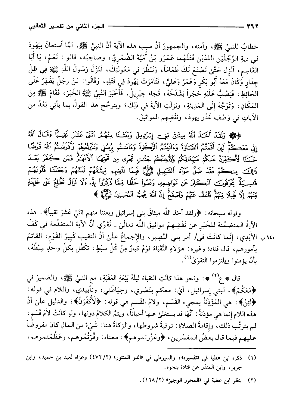 وَلَقَدْ أَخَذَ اللَّهُ مِيثاقَ بَنِي إِسْرائِيلَ وَبَعَثْنا مِنْهُمُ اثْنَيْ عَشَرَ نَقِيباً وَقالَ اللَّهُ إِنِّي مَعَكُمْ لَئِنْ أَقَمْتُمُ الصَّلاةَ وَآتَيْتُمُ الزَّكاةَ وَآمَنْتُمْ بِرُسُلِي وَعَزَّرْتُمُوهُمْ وَأَقْرَضْتُمُ اللَّهَ قَرْضاً حَسَناً لَأُكَفِّرَنَّ عَنْكُمْ سَيِّئاتِكُمْ وَلَأُدْخِلَنَّكُمْ جَنَّاتٍ تَجْرِي مِنْ تَحْتِهَا الْأَنْهارُ فَمَنْ كَفَرَ بَعْدَ ذلِكَ مِنْكُمْ فَقَدْ ضَلَّ سَواءَ السَّبِيلِ (12) فَبِما نَقْضِهِمْ مِيثاقَهُمْ لَعَنَّاهُمْ وَجَعَلْنا قُلُوبَهُمْ قاسِيَةً يُحَرِّفُونَ الْكَلِمَ عَنْ مَواضِعِهِ وَنَسُوا حَظًّا مِمَّا ذُكِّرُوا بِهِ وَلا تَزالُ تَطَّلِعُ عَلى خائِنَةٍ مِنْهُمْ إِلاَّ قَلِيلاً مِنْهُمْ فَاعْفُ عَنْهُمْ وَاصْفَحْ إِنَّ اللَّهَ يُحِبُّ الْمُحْسِنِينَ (13)