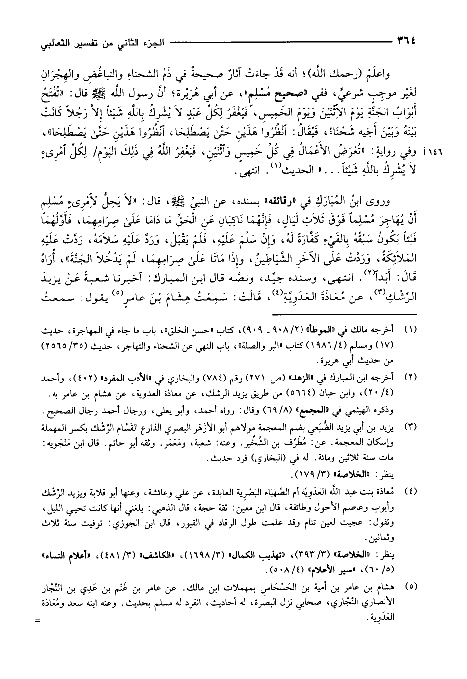 واعلَمْ (رحمك اللَّه) أنه قَدْ جاءَتْ آثارٌ صحيحةٌ في ذَمِّ الشحناءِ والتباغُضِ والهِجْرَانِ لغَيْر موجِبٍ شرعيٍّ، ففي «صحيح مُسْلِمٍ» ، عن أبي هريرة أنّ رسول الله صلّى الله عليه وسلّم قال: «تُفْتَحُ أَبْوَابُ الجَنَّةِ يَوْمَ الاِثْنَيْنَ وَيَوْمَ الخَمِيسِ، فَيُغْفَرُ لِكُلِّ عَبْدٍ لاَ يُشْرِكُ بِاللَّهِ شَيْئاً إلاَّ رَجُلاً كَانَتْ بَيْنَهُ وَبَيْنَ أَخِيه شَحْنَاءُ، فَيُقَالُ: انظروا هَذَيْنِ حتى يَصْطَلِحَا، انظروا هَذَيْنِ حتى يَصْطَلِحَا» ، وفي روايةٍ: «تُعْرَضُ الأَعْمَالُ فِي كُلِّ خَمِيسٍ واثنين، فَيَغْفِرُ اللَّهُ فِي ذلك اليوم/ لكلّ امرئ لاَ يُشْرِكُ باللَّهِ شَيْئاً ... » الحديث «1» . انتهى.