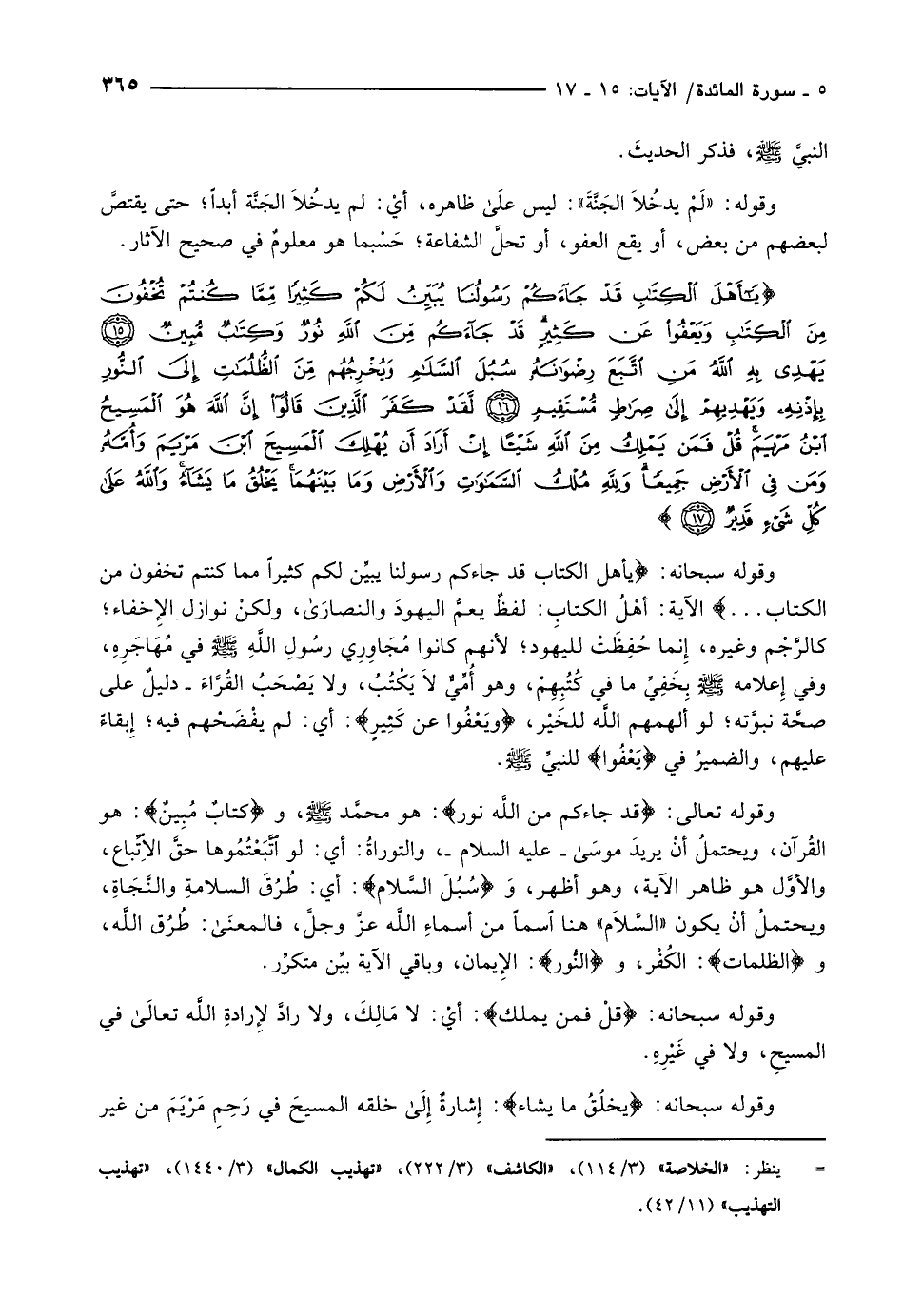 يا أَهْلَ الْكِتابِ قَدْ جاءَكُمْ رَسُولُنا يُبَيِّنُ لَكُمْ كَثِيراً مِمَّا كُنْتُمْ تُخْفُونَ مِنَ الْكِتابِ وَيَعْفُوا عَنْ كَثِيرٍ قَدْ جاءَكُمْ مِنَ اللَّهِ نُورٌ وَكِتابٌ مُبِينٌ (15) يَهْدِي بِهِ اللَّهُ مَنِ اتَّبَعَ رِضْوانَهُ سُبُلَ السَّلامِ وَيُخْرِجُهُمْ مِنَ الظُّلُماتِ إِلَى النُّورِ بِإِذْنِهِ وَيَهْدِيهِمْ إِلى صِراطٍ مُسْتَقِيمٍ (16) لَقَدْ كَفَرَ الَّذِينَ قالُوا إِنَّ اللَّهَ هُوَ الْمَسِيحُ ابْنُ مَرْيَمَ قُلْ فَمَنْ يَمْلِكُ مِنَ اللَّهِ شَيْئاً إِنْ أَرادَ أَنْ يُهْلِكَ الْمَسِيحَ ابْنَ مَرْيَمَ وَأُمَّهُ وَمَنْ فِي الْأَرْضِ جَمِيعاً وَلِلَّهِ مُلْكُ السَّماواتِ وَالْأَرْضِ وَما بَيْنَهُما يَخْلُقُ ما يَشاءُ وَاللَّهُ عَلى كُلِّ شَيْءٍ قَدِيرٌ (17)