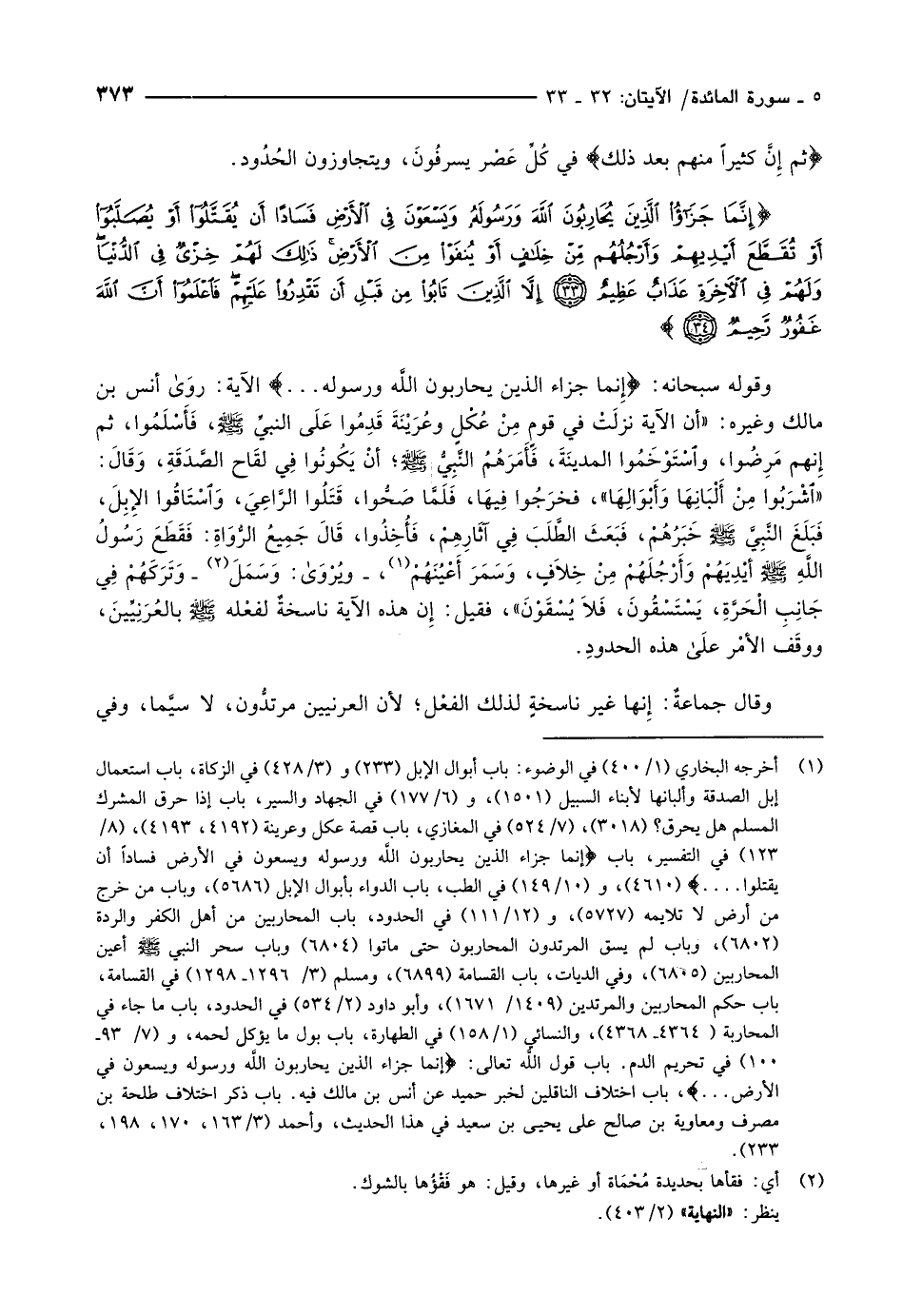 وقوله سبحانه: إِنَّما جَزاءُ الَّذِينَ يُحارِبُونَ اللَّهَ وَرَسُولَهُ ... الآية: روى أنس بن مالك وغيره: «أن الآية نزلَتْ في قومٍ مِنْ عُكْلٍ وعُرَيْنَةَ قَدِمُوا عَلَى النبيِّ صلّى الله عليه وسلّم، فَأَسْلَمُوا، ثم إنهم مَرِضُوا، واستوخموا المدينَةَ، فَأَمَرَهُمُ النّبيّ صلّى الله عليه وسلّم أنْ يَكُونُوا فِي لقَاح الصَّدَقَةِ، وَقَالَ: