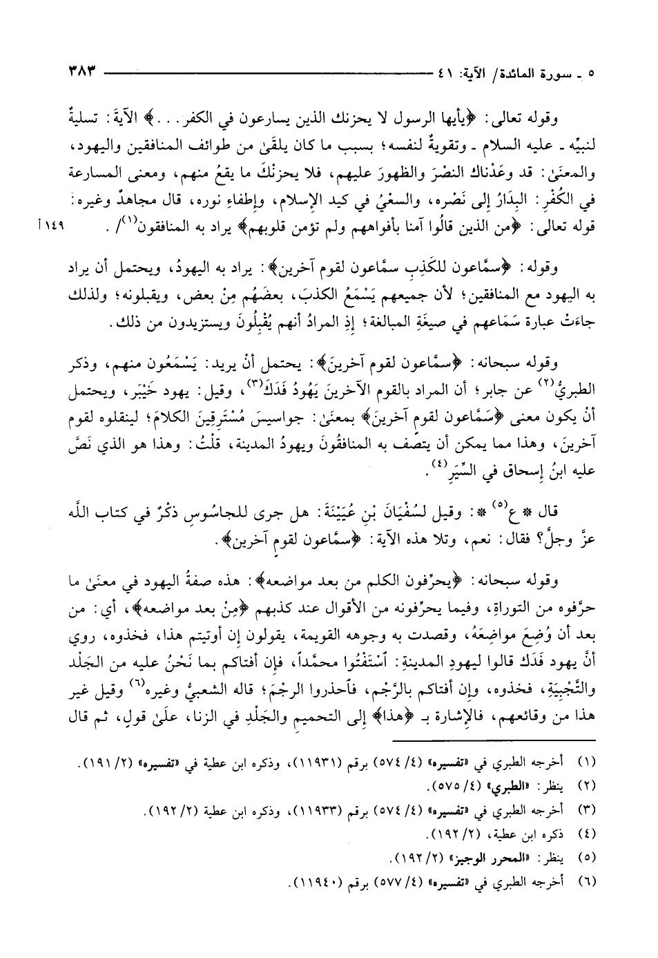وقوله: سَمَّاعُونَ لِلْكَذِبِ سَمَّاعُونَ لِقَوْمٍ آخَرِينَ: يراد به اليهودُ، ويحتمل أن يراد به اليهود مع المنافقين لأن جميعهم يَسْمَعُ الكذبَ، بعضَهُم مِنْ بعض، ويقبلونه ولذلك جاءَتْ عبارة سَمَاعهم في صيغَةِ المبالغة إذِ المرادُ أنهم يُقْبِلُونَ ويستزيدون من ذلك.