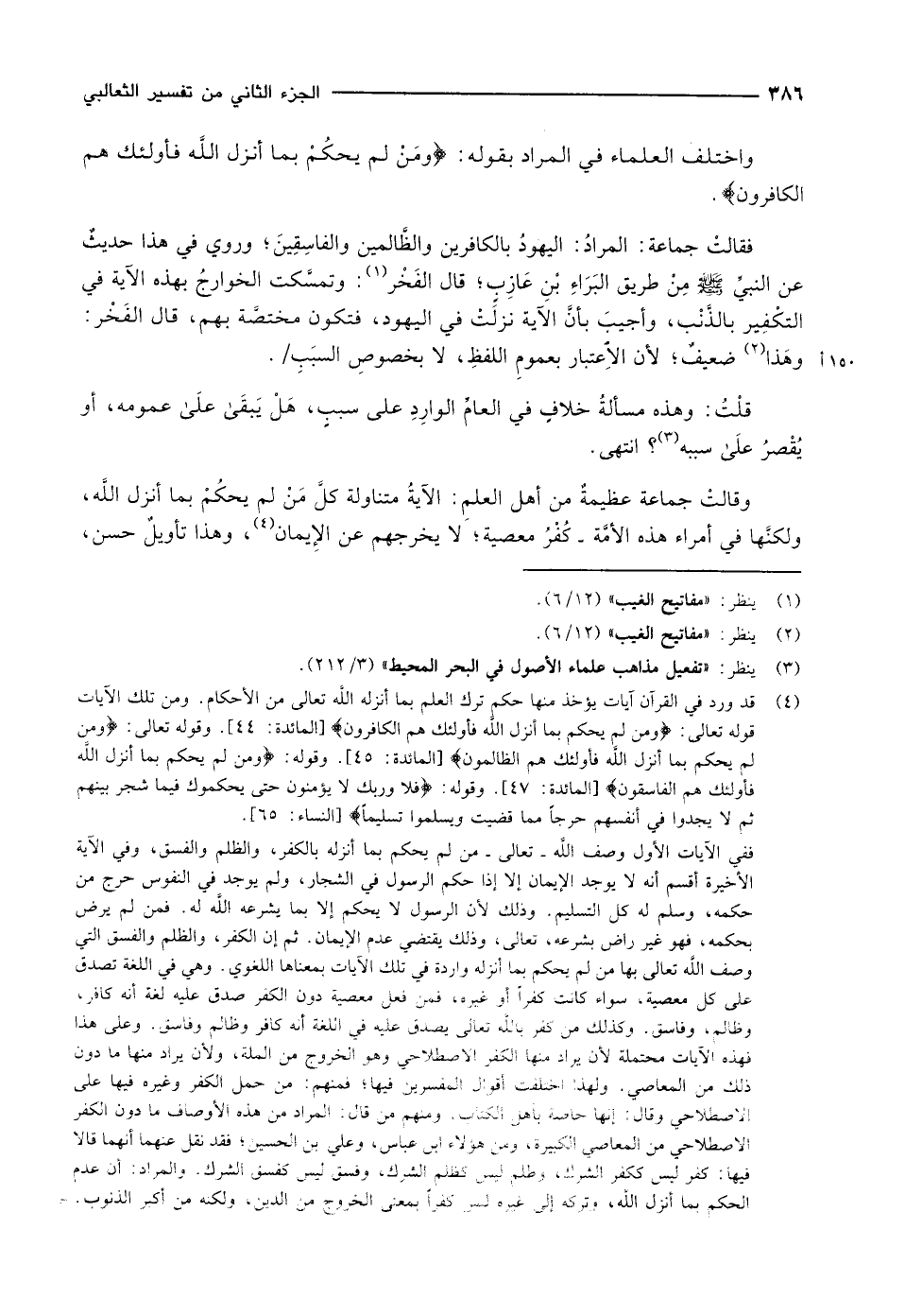 ففي الآيات الأول وصف الله- تعالى- من لم يحكم بما أنزله بالكفر، والظلم والفسق، وفي الآية الأخيرة أقسم أنه لا يوجد الإيمان إلا إذا حكم الرسول في الشجار، ولم يوجد في النفوس حرج من حكمه، وسلم له كل التسليم. وذلك لأن الرسول لا يحكم إلا بما يشرعه الله له. فمن لم يرض بحكمه، فهو غير راض بشرعه، تعالى، وذلك يقتضي عدم الإيمان. ثم إن الكفر، والظلم والفسق التي وصف الله تعالى بما من لم يحكم بما أنزله واردة في تلك الآيات بمعناها اللغوي. وهي في اللغة تصدق على كل معصية، سواء كانت كفرا أو غيره، فمن فعل معصية دون الكفر صدق عليه لغة أنه كافر، وظالم، وفاسق. وكذلك من كفر بالله تعالى يصدق عليه في اللغة أنه كافر وظالم وفاسق. وعلى هذا فهذه الآيات محتملة لأن يراد منها الكفر الاصطلاحي وهو الخروج من الملة، ولأن يراد منها ما دون ذلك من المعاصي. ولهذا اختلفت أقوال المفسرين فيها فمنهم: من حمل الكفر وغيره فيها على الاصطلاحي وقال: إنها خاصة بأهل الكتاب. ومنهم من قال: المراد من هذه الأوصاف ما دون الكفر الاصطلاحي من المعاصي الكبيرة، ومن هؤلاء ابن عباس، وعلي بن الحسين فقد نقل عنهما أنهما قالا فيها: كفر ليس ككفر الشرك، وظلم ليس كظلم الشرك، وفسق ليس كفسق الشرك. والمراد: أن عدم الحكم بما أنزل الله، وتركه إلى غيره ليس كفرا بمعنى الخروج من الدين، ولكنه من أكبر الذنوب. -