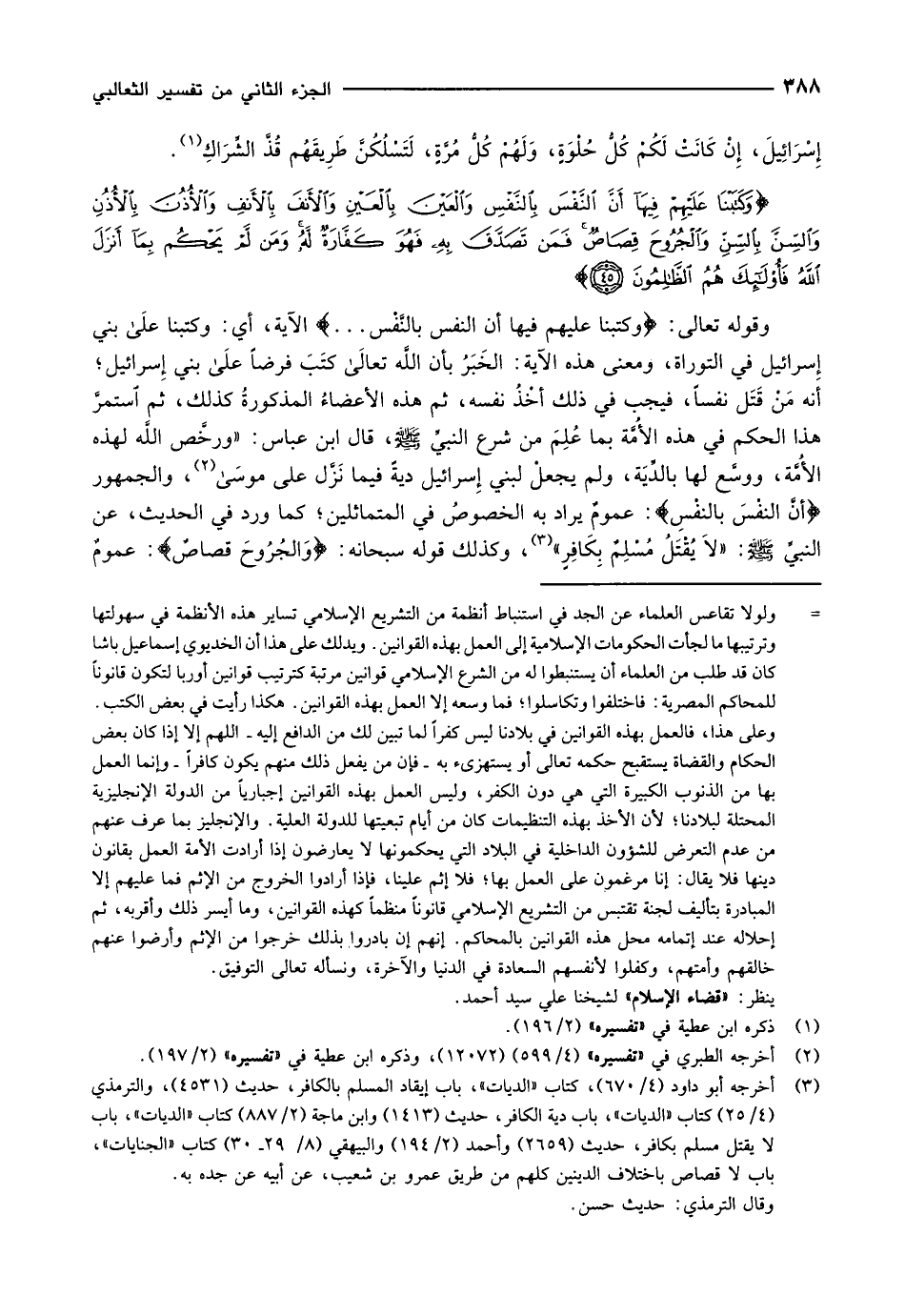 وقوله تعالى: وَكَتَبْنا عَلَيْهِمْ فِيها أَنَّ النَّفْسَ بِالنَّفْسِ ... الآية، أي: وكتبنا على بني إسرائيل في التوراة، ومعنى هذه الآية: الخَبَرُ بأن اللَّه تعالى كتَبَ فرضاً على بني إسرائيل أنه مَنْ قَتَل نفساً، فيجب في ذلك أخْذُ نفسه، ثم هذه الأعضاءُ المذكورةُ كذلك، ثم استمر هذا الحكم في هذه الأُمَّة بما علم من شرع النبيّ صلّى الله عليه وسلّم، قال ابن عباس: «ورخَّص اللَّه لهذه الأُمَّة، ووسَّع لها بالدِّيَة، ولم يجعلْ لبني إسرائيل ديةً فيما نَزَّل على موسى «2» ، والجمهور أَنَّ النَّفْسَ بِالنَّفْسِ: عمومٌ يراد به الخصوصُ في المتماثلين كما ورد في الحديث، عن النبيِّ صلّى الله عليه وسلّم: «لاَ يُقْتَلُ مُسْلِمٌ بِكَافِرٍ» «3» ، وكذلك قوله سبحانه: وَالْجُرُوحَ قِصاصٌ: عموم