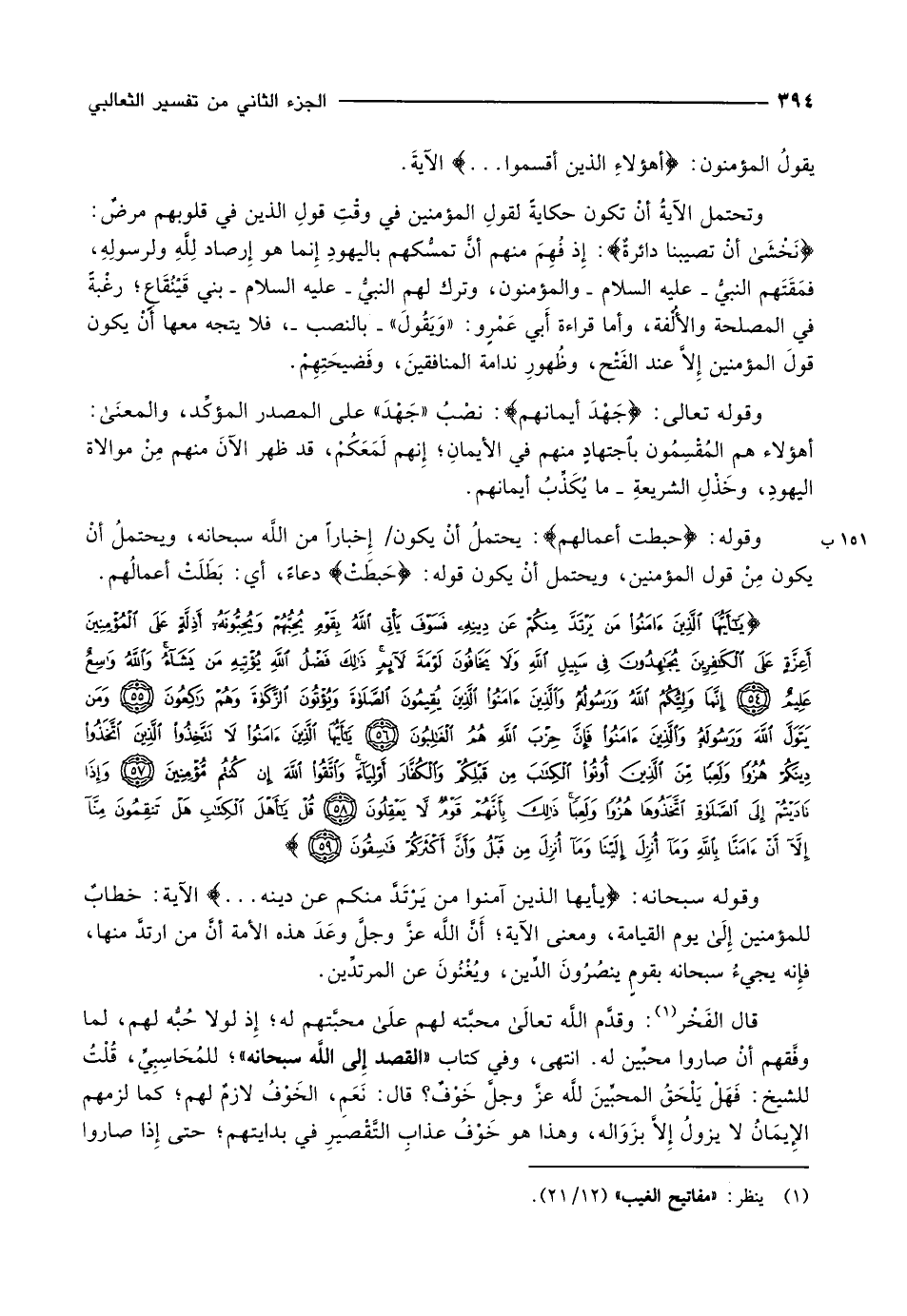 يا أَيُّهَا الَّذِينَ آمَنُوا مَنْ يَرْتَدَّ مِنْكُمْ عَنْ دِينِهِ فَسَوْفَ يَأْتِي اللَّهُ بِقَوْمٍ يُحِبُّهُمْ وَيُحِبُّونَهُ أَذِلَّةٍ عَلَى الْمُؤْمِنِينَ أَعِزَّةٍ عَلَى الْكافِرِينَ يُجاهِدُونَ فِي سَبِيلِ اللَّهِ وَلا يَخافُونَ لَوْمَةَ لائِمٍ ذلِكَ فَضْلُ اللَّهِ يُؤْتِيهِ مَنْ يَشاءُ وَاللَّهُ واسِعٌ عَلِيمٌ (54) إِنَّما وَلِيُّكُمُ اللَّهُ وَرَسُولُهُ وَالَّذِينَ آمَنُوا الَّذِينَ يُقِيمُونَ الصَّلاةَ وَيُؤْتُونَ الزَّكاةَ وَهُمْ راكِعُونَ (55) وَمَنْ يَتَوَلَّ اللَّهَ وَرَسُولَهُ وَالَّذِينَ آمَنُوا فَإِنَّ حِزْبَ اللَّهِ هُمُ الْغالِبُونَ (56) يا أَيُّهَا الَّذِينَ آمَنُوا لا تَتَّخِذُوا الَّذِينَ اتَّخَذُوا دِينَكُمْ هُزُواً وَلَعِباً مِنَ الَّذِينَ أُوتُوا الْكِتابَ مِنْ قَبْلِكُمْ وَالْكُفَّارَ أَوْلِياءَ وَاتَّقُوا اللَّهَ إِنْ كُنْتُمْ مُؤْمِنِينَ (57) وَإِذا نادَيْتُمْ إِلَى الصَّلاةِ اتَّخَذُوها هُزُواً وَلَعِباً ذلِكَ بِأَنَّهُمْ قَوْمٌ لا يَعْقِلُونَ (58)