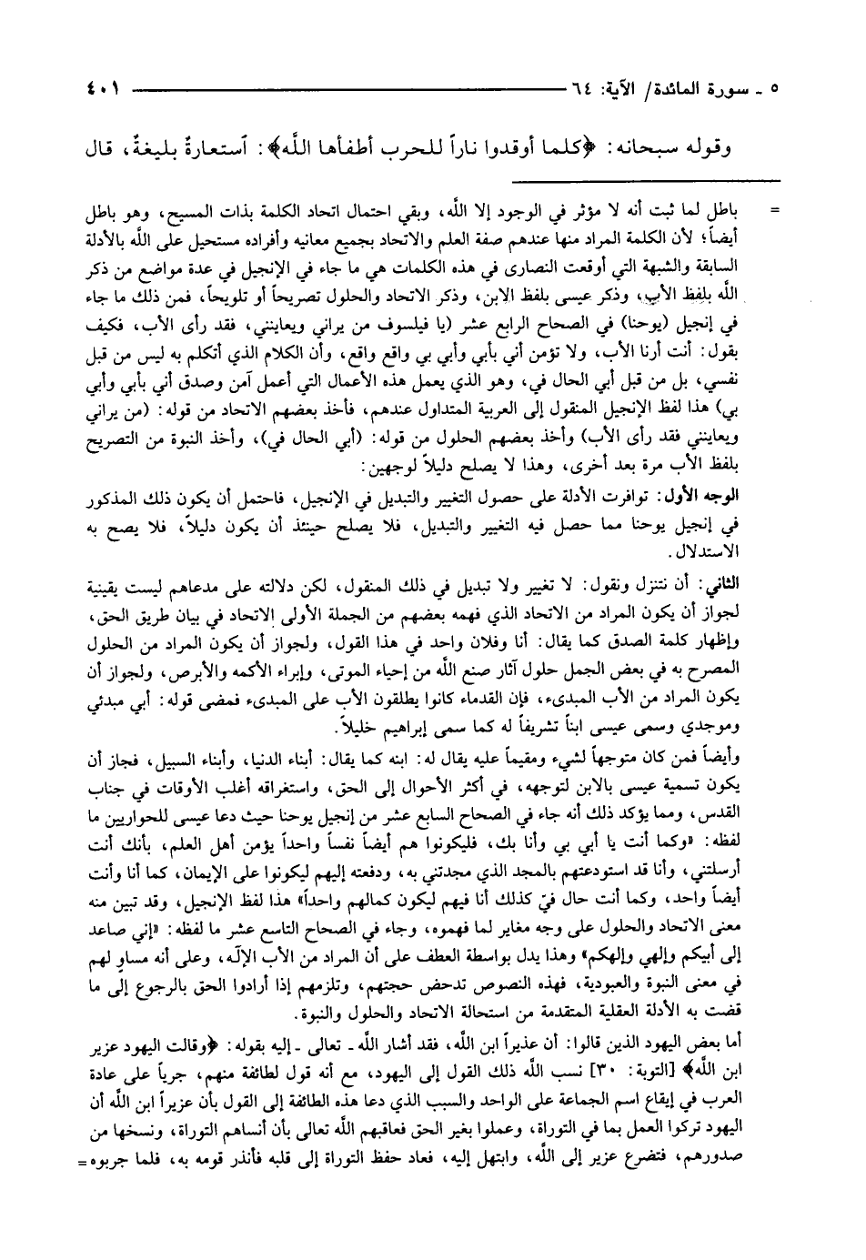 - باطل لما ثبت أنه لا مؤثر في الوجود إلا الله، وبقي احتمال اتحاد الكلمة بذات المسيح، وهو باطل أيضا لأن الكلمة المراد منها عندهم صفة العلم والاتحاد بجميع معانيه وأفراده مستحيل على الله بالأدلة السابقة والشبهة التي أوقعت النصارى في هذه الكلمات هي ما جاء في الإنجيل في عدة مواضع من ذكر الله بلفظ الأب، وذكر عيسى بلفظ الابن، وذكر الاتحاد والحلول تصريحا أو تلويحا، فمن ذلك ما جاء في إنجيل (يوحنا) في الصحاح الرابع عشر (يا فيلسوف من يراني ويعاينني، فقد رأى الأب، فكيف بقول: أنت أرنا الأب، ولا تؤمن أني بأبي وأبي بي واقع واقع، وأن الكلام الذي أتكلم به ليس من قبل نفسي، بل من قبل أبي الحال في، وهو الذي يعمل هذه الأعمال التي أعمل آمن وصدق أني بأبي وأبي بي) هذا لفظ الإنجيل المنقول إلى العربية المتداول عندهم، فأخذ بعضهم الاتحاد من قوله: (من يراني ويعاينني فقد رأى الأب) وأخذ بعضهم الحلول من قوله: (أبي الحال في) ، وأخذ النبوة من التصريح بلفظ الأب مرة بعد أخرى، وهذا لا يصلح دليلا لوجهين: