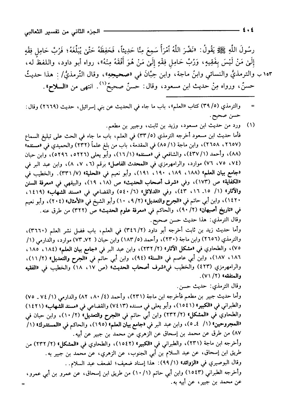 رسول الله صلّى الله عليه وسلّم يَقُولُ: «نَضَّرَ اللَّهُ امرأ سَمِعَ مِنَّا حَدِيثاً، فَحَفِظَهُ حتى يُبَلِّغَهُ فَرُبَّ حَامِلٍ فِقْهٍ إلى مَنْ لَيْسَ بِفَقِيةٍ، وَرُبَّ حَامِلِ فِقْهٍ إلى مَنْ هُوَ أَفْقَهُ مِنْهُ» ، رواه أبو داودَ، واللفظ له، والترمذيُّ والنسائِيُّ وابنُ ماجه، وابن حِبَّانَ في «صحيحِهِ» ، وقال التِّرمذيُّ/: هذا حديثٌ حسنٌ، ورواه مِنْ حديث ابن مسعود، وقال: حسن صحيح «1» . انتهى من «السلاح» .