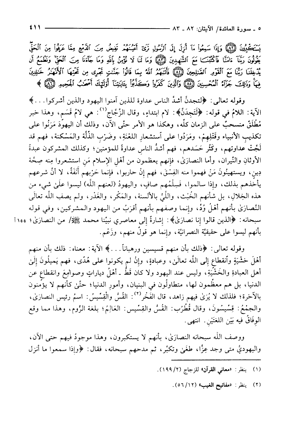 لَتَجِدَنَّ أَشَدَّ النَّاسِ عَداوَةً لِلَّذِينَ آمَنُوا الْيَهُودَ وَالَّذِينَ أَشْرَكُوا وَلَتَجِدَنَّ أَقْرَبَهُمْ مَوَدَّةً لِلَّذِينَ آمَنُوا الَّذِينَ قالُوا إِنَّا نَصارى ذلِكَ بِأَنَّ مِنْهُمْ قِسِّيسِينَ وَرُهْباناً وَأَنَّهُمْ لا يَسْتَكْبِرُونَ (82) وَإِذا سَمِعُوا مَا أُنْزِلَ إِلَى الرَّسُولِ تَرى أَعْيُنَهُمْ تَفِيضُ مِنَ الدَّمْعِ مِمَّا عَرَفُوا مِنَ الْحَقِّ يَقُولُونَ رَبَّنا آمَنَّا فَاكْتُبْنا مَعَ الشَّاهِدِينَ (83) وَما لَنا لاَ نُؤْمِنُ بِاللَّهِ وَما جاءَنا مِنَ الْحَقِّ وَنَطْمَعُ أَنْ يُدْخِلَنا رَبُّنا مَعَ الْقَوْمِ الصَّالِحِينَ (84) فَأَثابَهُمُ اللَّهُ بِما قالُوا جَنَّاتٍ تَجْرِي مِنْ تَحْتِهَا الْأَنْهارُ خالِدِينَ فِيها وَذلِكَ جَزاءُ الْمُحْسِنِينَ (85) وَالَّذِينَ كَفَرُوا وَكَذَّبُوا بِآياتِنا أُولئِكَ أَصْحابُ الْجَحِيمِ (86)