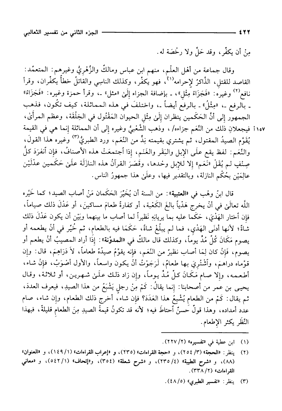 القاصد للقتلِ، الذَّاكرُ لإِحرامه «1» ، فهو يكفِّر، وكذلك الناسِي والقاتلُ خطأً يكفِّران، وقرأ نافع «2» وغيره: «فَجَزَاءُ مِثْلِ» ، - بإضافة الجزاء إلى «مثل» -، وقرأ حمزة وغيره: «فَجَزَاءُ» - بالرفع-، «مِثْلُ» - بالرفع أيضاً-، واختلفَ في هذه المماثلة، كيف تكُون، فذهب الجمهور إلى أنَّ الحَكَمين ينظران إلى مِثْلِ الحيوان المَقْتُول في الخِلْقَة، وعظم المرأى، فيجعلانِ ذلك من النَّعَم جزاءه/، وذهب الشَّعْبيُّ وغيره إلى أن المماثلة إنما هي في القيمة يُقَوَّم الصيدُ المقتول، ثم يشتري بقيمته نِدٌّ من النَّعَم، ورد الطبريُّ «3» وغيره هذا القولَ، والنَّعَم: لفظ يقع علَى الإبل والبَقَر والغَنَم، إذا اجتمعت هذه الأصنافُ، فإن انفرد كلُّ صِنْفٍ لم يُقَلْ «نَعَم» إلا للإبل وحْدها، وقَصَرَ القرآنُ هذه النازَلَة على حَكَمين عدْلَيْن عالِمَيْن بحُكْم النازلة، وبالتقدير فيها، وعلى هذا جمهورُ الناس.