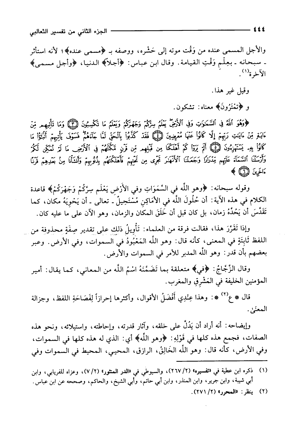 وقوله سبحانه: وَهُوَ اللَّهُ فِي السَّماواتِ وَفِي الْأَرْضِ يَعْلَمُ سِرَّكُمْ وَجَهْرَكُمْ قاعدة الكلام في هذه الآية: أن حُلُولَ اللَّه في الأمَاكِنِ مُسْتَحِيلٌ- تعالى- أن يَحْوِيَهُ مكان، كما تَقَدَّسَ أن يَحُدَّهُ زمان، بل كان قبل أن خَلَقَ المكان والزمان، وهو الآن على ما عليه كان.