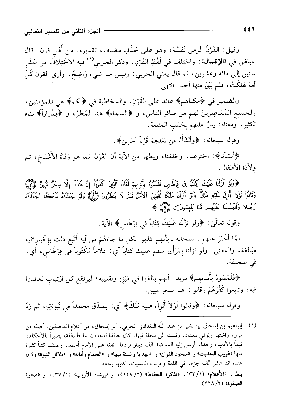(1) إبراهيم بن إسحاق بن بشير بن عبد الله البغدادي الحربي، أبو إسحاق، من أعلام المحدثين. أصله من مرو، واشتهر وتوفي ببغداد، ونسبته إلى محلة فيها. كان حافظا للحديث عارفا بالفقه بصيرا بالأحكام، قيما بالأدب، زاهدا، أرسل إليه المعتضد ألف دينار فردها. تفقه على الإمام أحمد، وصنف كتبا كثيرة منها «غريب الحديث» و «سجود القرآن» و «الهدايا والسنة فيها» و «الحمام وآدابه» و «دلائل النبوة» وكان عنده اثنا عشر ألف جزء، في اللغة وغريب الحديث، كتبها بخطه.