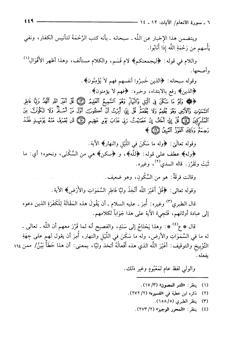 وَلَهُ ما سَكَنَ فِي اللَّيْلِ وَالنَّهارِ وَهُوَ السَّمِيعُ الْعَلِيمُ (13) قُلْ أَغَيْرَ اللَّهِ أَتَّخِذُ وَلِيًّا فاطِرِ السَّماواتِ وَالْأَرْضِ وَهُوَ يُطْعِمُ وَلا يُطْعَمُ قُلْ إِنِّي أُمِرْتُ أَنْ أَكُونَ أَوَّلَ مَنْ أَسْلَمَ وَلا تَكُونَنَّ مِنَ الْمُشْرِكِينَ (14) قُلْ إِنِّي أَخافُ إِنْ عَصَيْتُ رَبِّي عَذابَ يَوْمٍ عَظِيمٍ (15) مَنْ يُصْرَفْ عَنْهُ يَوْمَئِذٍ فَقَدْ رَحِمَهُ وَذلِكَ الْفَوْزُ الْمُبِينُ (16)