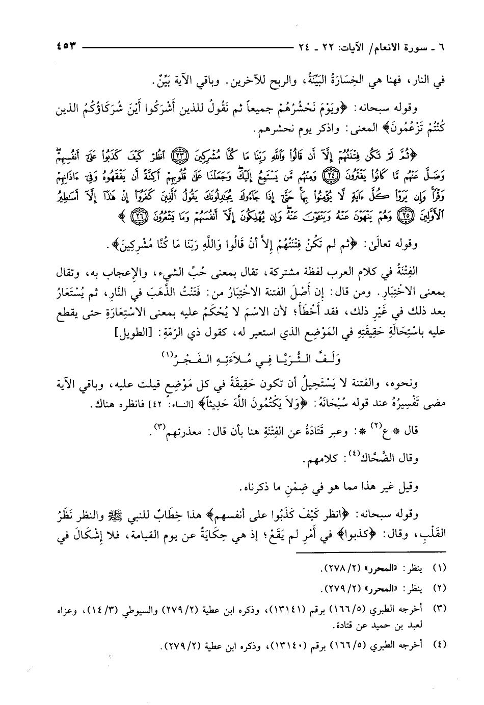 ثُمَّ لَمْ تَكُنْ فِتْنَتُهُمْ إِلاَّ أَنْ قالُوا وَاللَّهِ رَبِّنا ما كُنَّا مُشْرِكِينَ (23) انْظُرْ كَيْفَ كَذَبُوا عَلى أَنْفُسِهِمْ وَضَلَّ عَنْهُمْ ما كانُوا يَفْتَرُونَ (24) وَمِنْهُمْ مَنْ يَسْتَمِعُ إِلَيْكَ وَجَعَلْنا عَلى قُلُوبِهِمْ أَكِنَّةً أَنْ يَفْقَهُوهُ وَفِي آذانِهِمْ وَقْراً وَإِنْ يَرَوْا كُلَّ آيَةٍ لاَّ يُؤْمِنُوا بِها حَتَّى إِذا جاؤُكَ يُجادِلُونَكَ يَقُولُ الَّذِينَ كَفَرُوا إِنْ هذا إِلاَّ أَساطِيرُ الْأَوَّلِينَ (25) وَهُمْ يَنْهَوْنَ عَنْهُ وَيَنْأَوْنَ عَنْهُ وَإِنْ يُهْلِكُونَ إِلاَّ أَنْفُسَهُمْ وَما يَشْعُرُونَ (26)