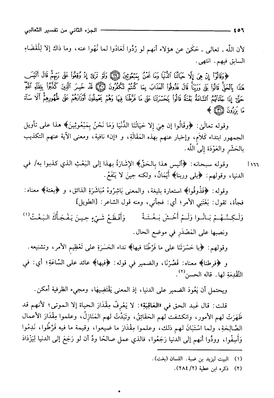وقوله تعالى: وَقالُوا إِنْ هِيَ إِلَّا حَياتُنَا الدُّنْيا وَما نَحْنُ بِمَبْعُوثِينَ هذا على تأويل الجمهور ابتداء كَلاَمٍ، وإخبار عنهم بهذه المَقَالَةِ، و «إن» نافية، ومعنى الآية عنهم التكذيب بالحَشْرِ والعَوْدَة إلى اللَّه.