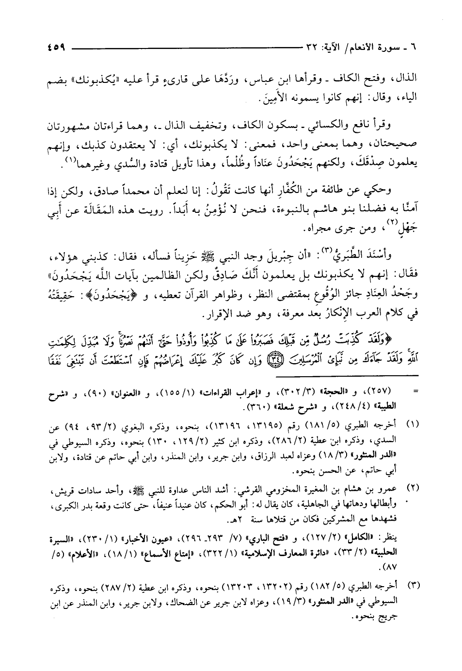 وقرأ نافع والكسائي- بسكون الكاف، وتخفيف الذال-، وهما قراءتان مشهورتان صحيحتان، وهما بمعنى واحد، فمعنى: لا يكذبونك، أي: لا يعتقدون كذبك، وإنهم يعلمون صِدْقَكَ، ولكنهم يَجْحَدُونَ عنَاداً وظُلْماً، وهذا تأويل قتادة والسُّدي وغيرهما «1» .
