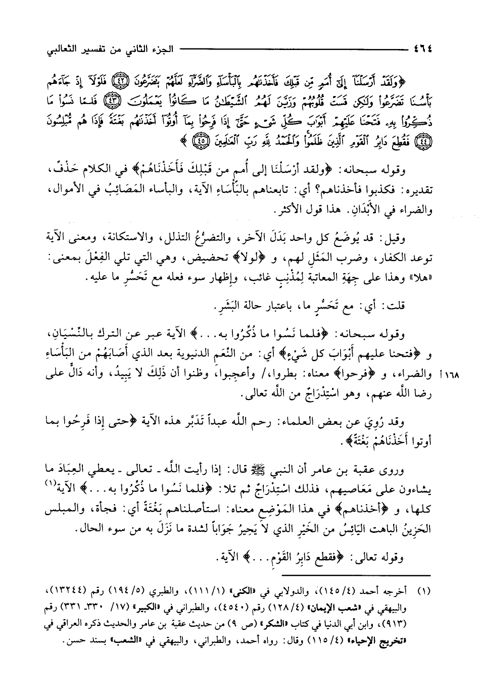 (1) أخرجه أحمد (4/ 145) ، والدولابي في «الكنى» (1/ 111) ، والطبري (5/ 194) رقم (13244) ، والبيهقي في «شعب الإيمان» (4/ 128) رقم (4540) ، والطبراني في «الكبير» (17/ 330- 331) رقم (913) ، وابن أبي الدنيا في كتاب «الشكر» (ص 9) من حديث عقبة بن عامر والحديث ذكره العراقي في «تخريج الإحياء» (4/ 115) وقال: رواه أحمد، والطبراني، والبيهقي في «الشعب» بسند حسن.