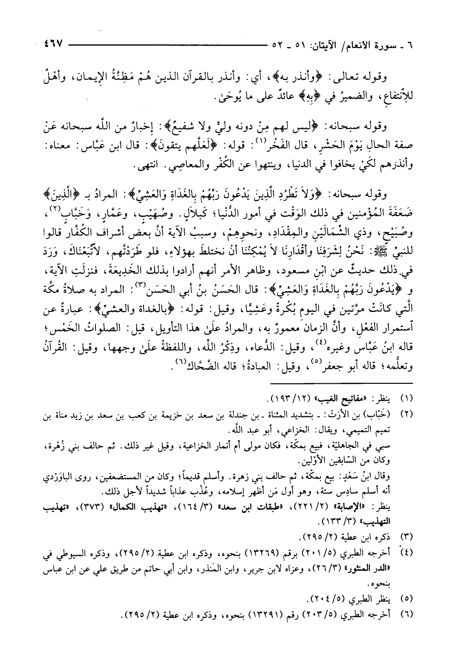 وقوله سبحانه: وَلا تَطْرُدِ الَّذِينَ يَدْعُونَ رَبَّهُمْ بِالْغَداةِ وَالْعَشِيِّ: المرادُ ب الَّذِينَ ضَعَفَةَ المُؤْمنين في ذلك الوَقْت في أمور الدُّنْيا كَبَلاَلٍ. وصُهَيْبٍ، وعَمَّارٍ، وَخَبَّابٍ «2» ، وصُبَيْحٍ، وذي الشِّمَالَيْنِ والمِقْدَادِ، ونحوِهِمْ، وسببُ الآية أنَّ بعض أشراف الكفّار قالوا للنبيّ صلّى الله عليه وسلّم: نَحْنُ لِشَرَفِنَا وأقْدَارِنَا لاَ يُمْكِنُنَا أنْ نختلطَ بهؤلاءِ، فلو طَرَدْتَّهم، لأتَّبَعْنَاكَ، وَرَدَ في ذلك حديثٌ عن ابْنِ مسعود، وظاهر الأمر أنهم أرادوا بذلك الخديعة، فنزلت الآية، ويَدْعُونَ رَبَّهُمْ بِالْغَداةِ وَالْعَشِيِّ: قال الحَسَنُ بنُ أبي الحَسَن «3» : المراد به صلاةُ مكَّة الَّتي كانَتْ مرَّتين في اليومِ بُكْرةً وعَشِيًّا، وقيل: قوله: بِالْغَداةِ وَالْعَشِيِّ: عبارةٌ عن استمرار الفعْلِ، وأنَّ الزمان معمورٌ به، والمرادُ على هذا التأويل، قيل: الصلواتُ الخَمْس قاله ابنُ عَبَّاس وغيره «4» ، وقيل: الدُّعاء، وذِكْرُ اللَّه، واللفظةُ على وجهها، وقيل: القُرآنُ وتعلُّمه قاله أبو جعفر «5» ، وقيل: العبادة قاله الضّحّاك «6» .
