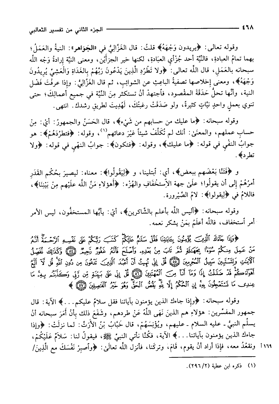 وقوله تعالى: يُرِيدُونَ وَجْهَهُ قلتُ: قال الغَزَّالِيُّ في «الجَوَاهر» : النيةُ والعَمَلُ بهما تمامُ العبادةِ، فالنِّيَّة أحد جُزْأيِ العبَادةِ، لكنها خير الجزأَيْن، ومعنى النيَّة إرادةُ وَجْه اللَّه سبحانه بالعَمَلِ، قال اللَّه تعالى: وَلا تَطْرُدِ الَّذِينَ يَدْعُونَ رَبَّهُمْ بِالْغَداةِ وَالْعَشِيِّ يُرِيدُونَ وَجْهَهُ، ومعنى إخلاصها تصفيةُ الباعِثِ عن الشوائِبِ، ثم قال الغَزَّالِيُّ: وإذا عرفْتَ فَضْل النية، وأنَّها تحلُّ حَدَقَةَ المقْصود، فاجتهد أنْ تستكثر مِنَ النِّيَّة في جميع أعمالِكَ حتى تنوي بعملٍ واحدٍ نيَّاتٍ كثيرة، ولو صَدَقَتْ رغبتُكَ، لَهُدِيتَ لطريقِ رشدك. انتهى.