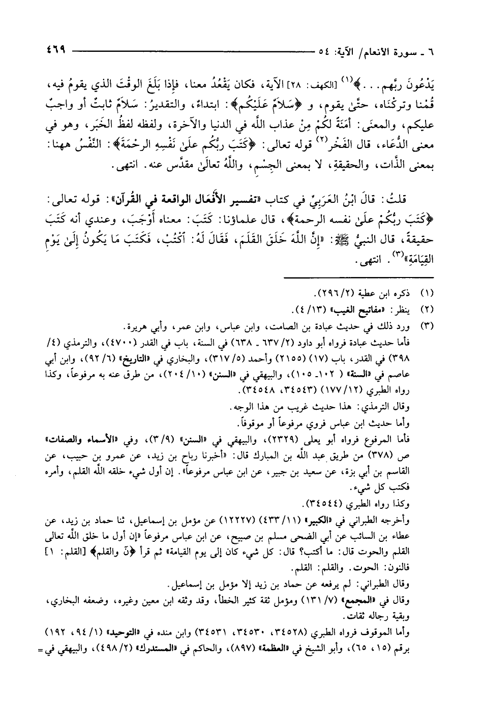 كَتَبَ رَبُّكُمْ عَلى نَفْسِهِ الرَّحْمَةَ، قال علماؤنا: كَتَبَ: معناه أَوْجَبَ، وعندي أنه كتب حقيقة، قال النبيّ صلّى الله عليه وسلّم: «إنَّ اللَّهَ خَلَقَ القَلَمَ، فَقَالَ لَهُ: اكتب، فَكَتَبَ مَا يَكُونُ إلى يَوْمِ القِيَامَةِ» «3» . انتهى.