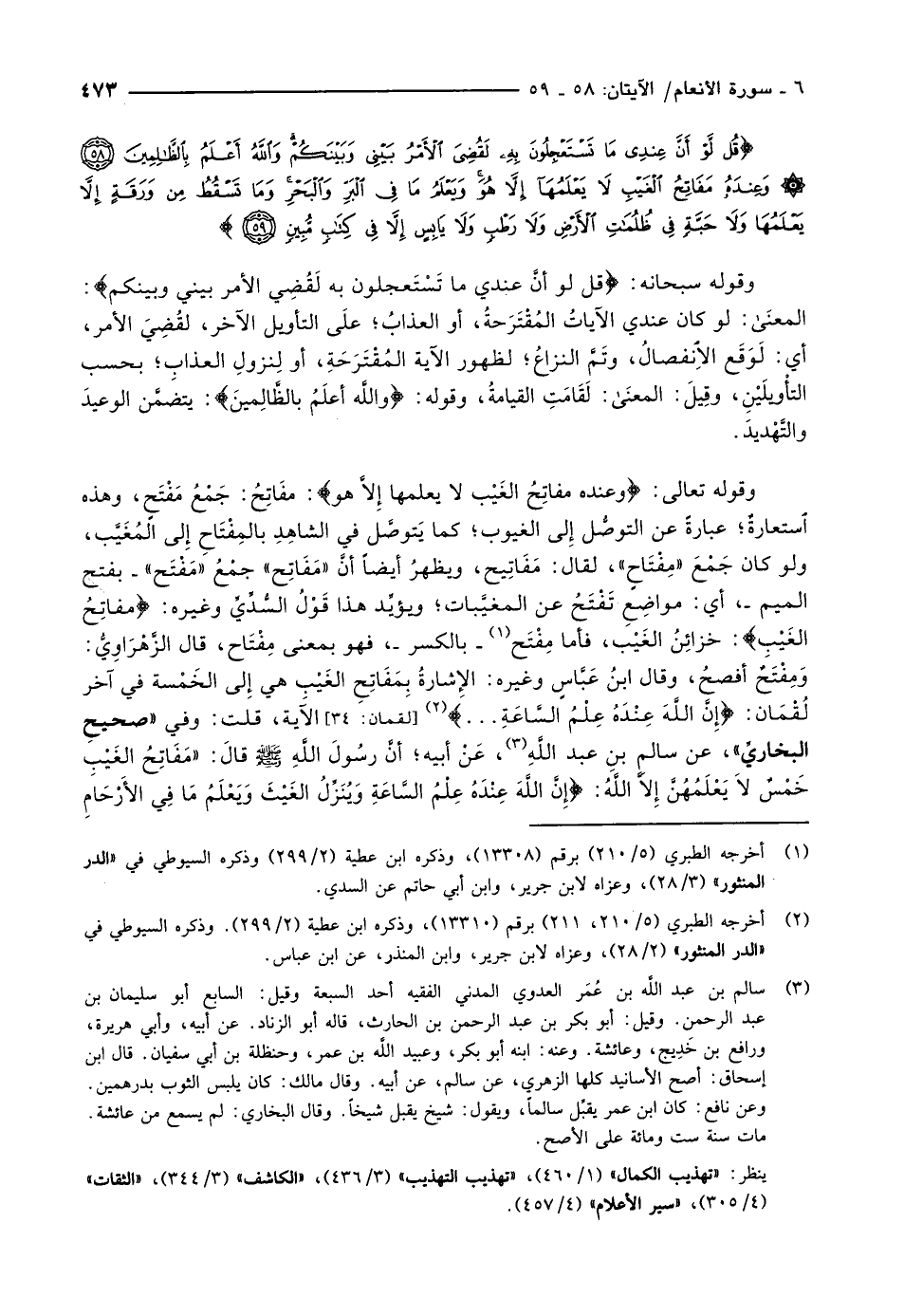 وَمِفْتَحٌ أفصحُ، وقال ابنُ عَبَّاسٍ وغيره: الإشارةُ بِمَفَاتِحِ الغَيْبِ هي إلى الخَمْسة في آخر لُقْمَان: إِنَّ اللَّهَ عِنْدَهُ عِلْمُ السَّاعَةِ ... «2» [لقمان: 34] الآية، قلت: وفي «صحيحِ البخاريِّ» ، عن سالمِ بنِ عبد اللَّهِ «3» ، عَنْ أبيه أنَّ رسُولَ الله صلّى الله عليه وسلّم قالَ: «مَفَاتِحُ الغَيْبِ خَمْسٌ لاَ يَعْلَمُهُنَّ إلاَّ اللَّهُ: إِنَّ اللَّهَ عِنْدَهُ عِلْمُ السَّاعَةِ وَيُنَزِّلُ الْغَيْثَ وَيَعْلَمُ ما فِي الْأَرْحامِ