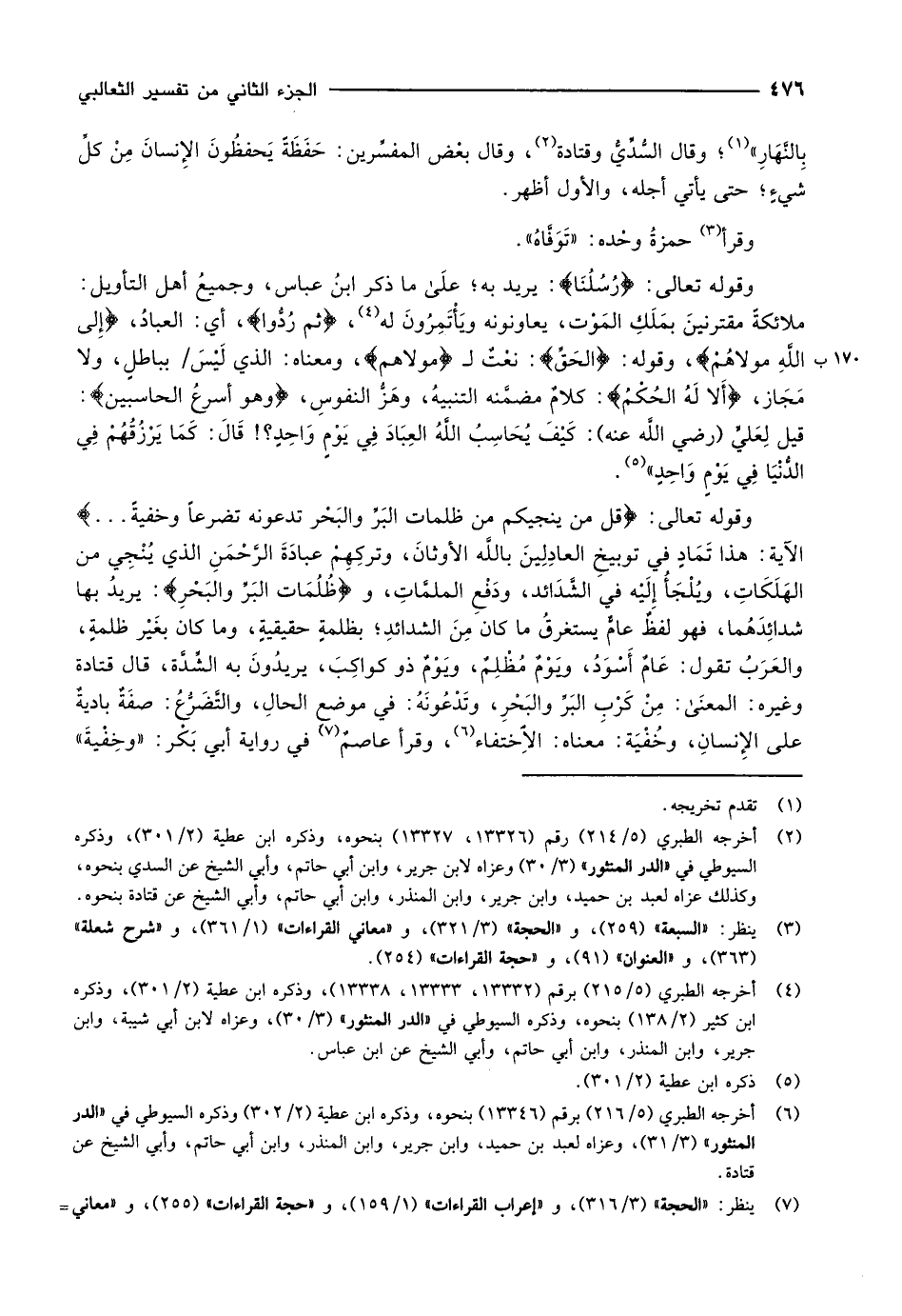بِالنَّهَارِ» «1» وقال السُّدِّيُّ وقتادة «2» ، وقال بعْض المفسِّرين: حَفَظَةً يَحفظُونَ الإنسانَ مِنْ كلِّ شيءٍ حتى يأتي أجله، والأول أظهر.