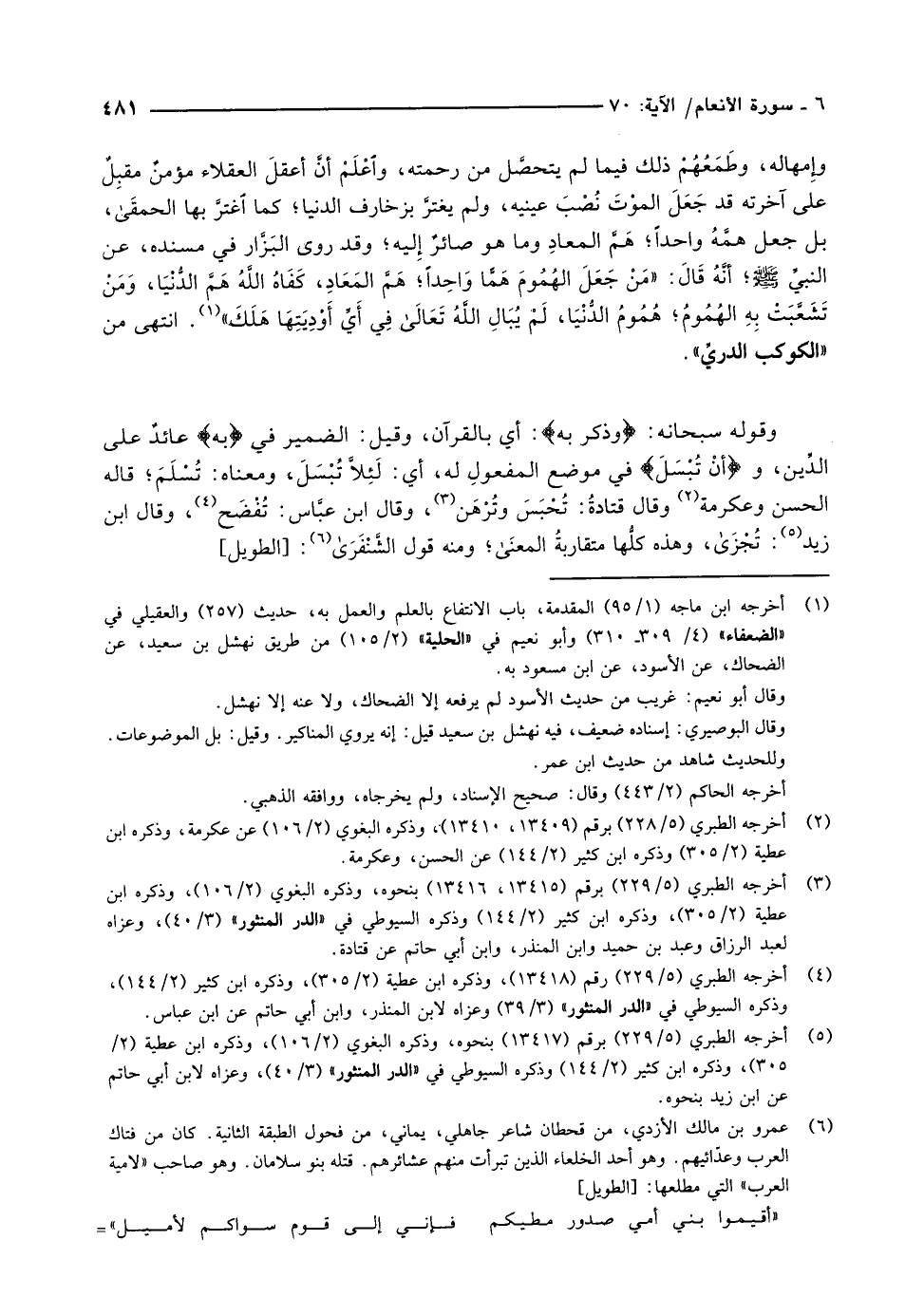 وقوله سبحانه: وَذَكِّرْ بِهِ: أي بالقرآن، وقيل: الضمير في بِهِ عائد على الدّين، وأَنْ تُبْسَلَ في موضع المفعولِ له، أي: لَئِلاَّ تُبْسَلَ، ومعناه: تُسْلَمَ قاله الحسن وعكرمة «2» وقال قتادةُ: تُحْبَسَ وتُرْهَنْ «3» ، وقال ابن عبَّاس: تُفْضَح «4» ، وقال ابن زيد «5» : تجزى، وهذه كلُّها متقاربةُ المعنى ومنه قول الشّنفرى «6» : [الطويل]