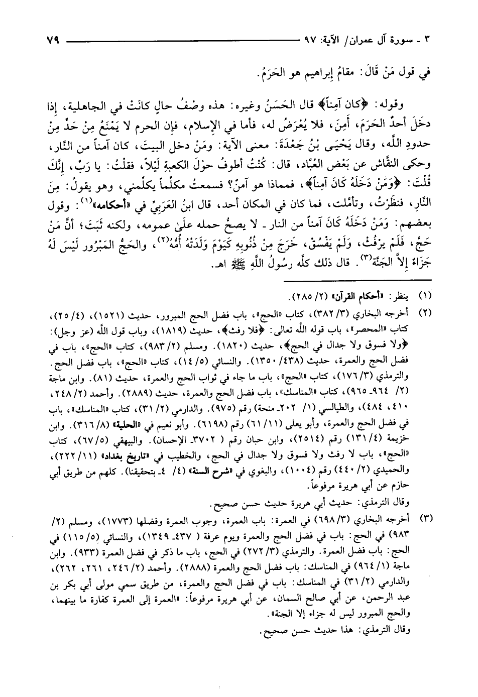 وقوله: كانَ آمِناً قال الحَسَنُ وغيره: هذه وصْفُ حالٍ كانَتْ في الجاهلية، إذا دخَلَ أحدٌ الحَرَمَ، أَمِنَ، فلا يُعْرَضُ له، فأما في الإسلام، فإن الحرم لا يَمْنَعُ مِنْ حَدٍّ مِنْ حدودِ اللَّه، وقال يَحْيَى بْنُ جَعْدَةَ: معنى الآية: ومَنْ دخل البيتَ، كان آمناً من النَّار، وحكى النقَّاش عن بَعْض العُبَّاد، قال: كُنْتُ أطوفُ حوْلَ الكعبةِ لَيْلاً، فقلْتُ: يا رَبِّ، إنّك قلت: وَمَنْ دَخَلَهُ كانَ آمِناً، فمماذا هو آمنٌ؟ فسمعتُ مكلِّماً يكلِّمني، وهو يقولُ: مِنَ النَّارِ، فنظَرْتُ، وتأمَّلت، فما كان في المكان أحد، قال ابنُ العَرَبِيِّ في «أحكامه» «1» : وقول بعضهم: وَمَنْ دَخَلَهُ كَانَ آمناً من النار- لا يصحُّ حمله على عمومه، ولكنه ثَبَتَ أنَّ مَنْ حَجَّ، فَلَمْ يرْفُثْ، وَلَمْ يَفْسُقْ، خَرَجَ مِنْ ذُنُوبِهِ كَيَوْمَ وَلَدَتْهُ أُمُّهُ «2» ، والحَجُّ المَبْرُور لَيْسَ لَهُ جَزَاءٌ إلاَّ الجنّة «3» . قال ذلك كلّه رسول الله صلّى الله عليه وسلّم اهـ.